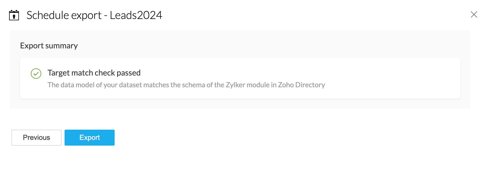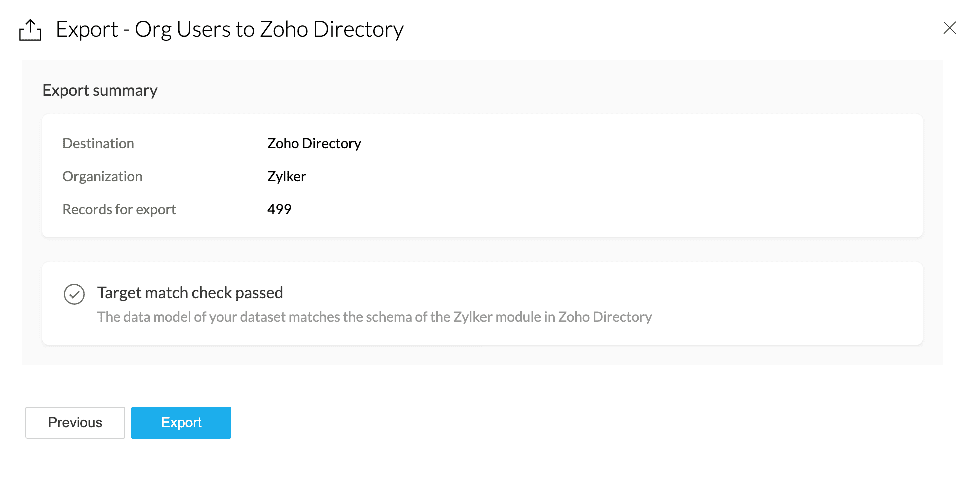 5. If the target match check fails, you need to fix the errors by completing the target matching steps. If the target match check is passed, you can proceed with exporting your data to Zoho Directory.
