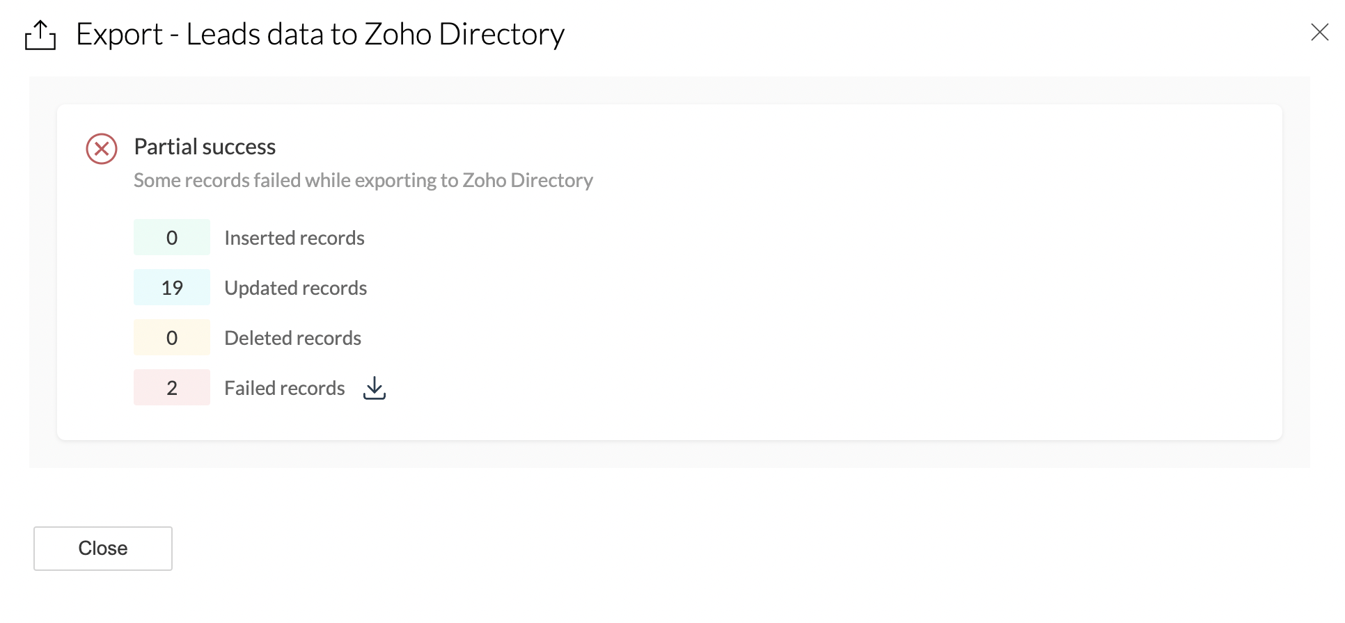 5. Once the export is complete, the export summary widget shows the number of records inserted, updated, deleted, and in some cases, failed to export, if there were any.