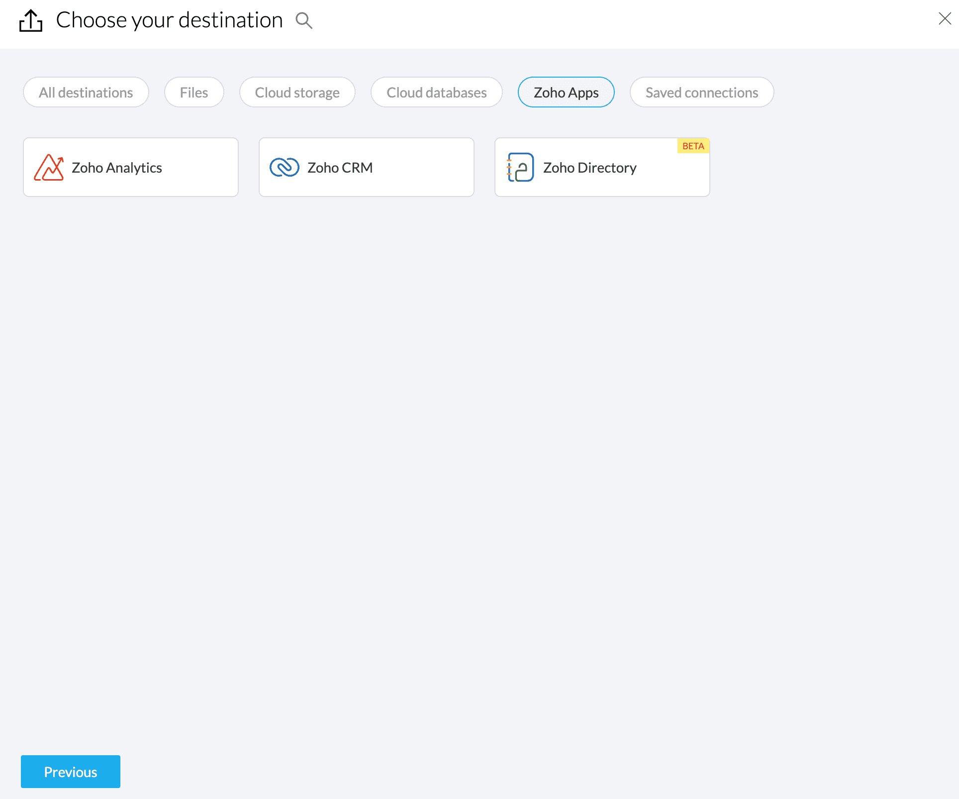 2. You can search Zoho Directory under the All destinations tab or choose it under the Zoho Apps category.