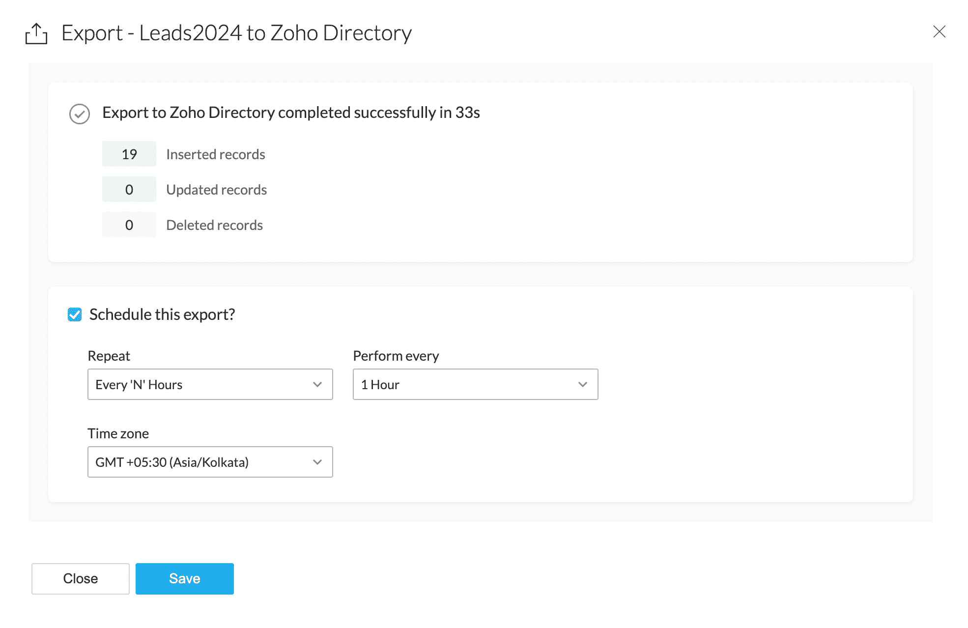 4. Datasets containing invalid or missing email ids cannot be exported to Zoho Directory. Please ensure the email_id column does not contain invalid values or missing values before scheduling export to Zoho Directory.