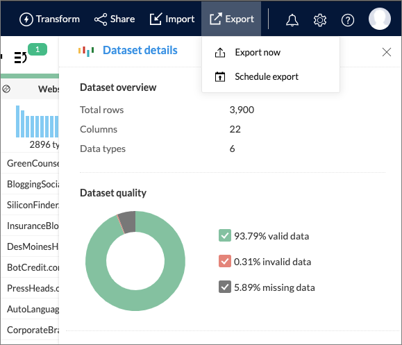 DataPrep offers a wide range of export options. Your data can be exported to BI tools, cloud storage services, cloud databases.  They can also be downloaded as files in different formats.