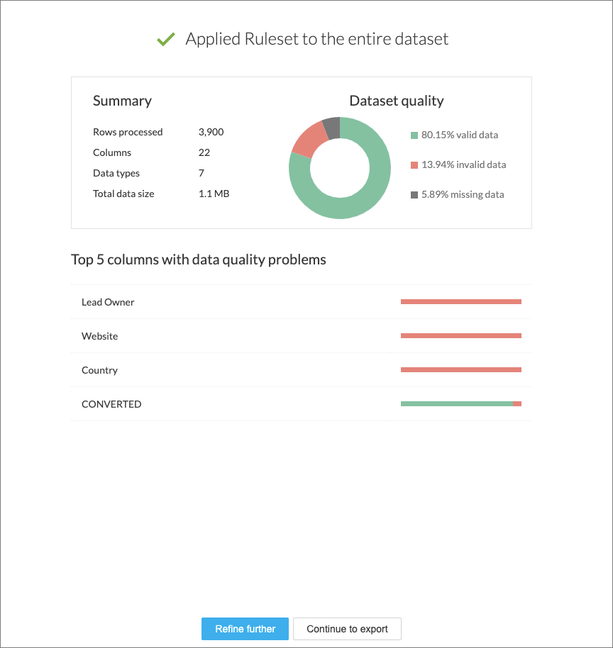 3. Next, the data quality results will be shown. You may choose to select the  Refine further  option and improve the data quality of your dataset.  This will take you back to the Studio page  where you can work on the data quality of your dataset.