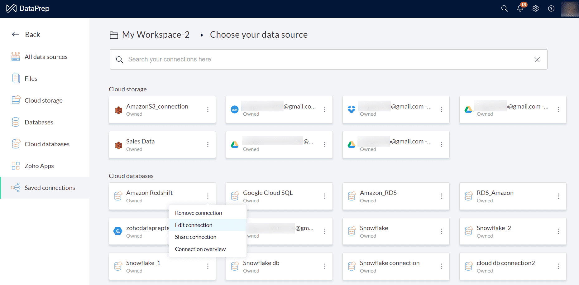 DataPrep saves your data connections to avoid the hassle of keying in the credentials every time you need to connect to a data source or destination. You can always edit the saved data connection and update them with new parameters or credentials using the Edit connection option.