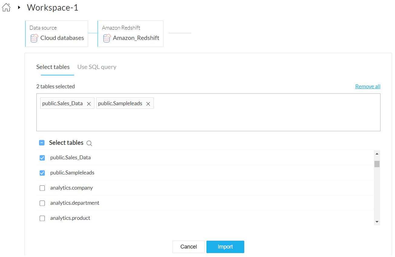 Note: If you have already added an Amazon Redshift connection, choose the required connection under the Saved connections category and proceed to import. To learn more about Saved connections, click here.