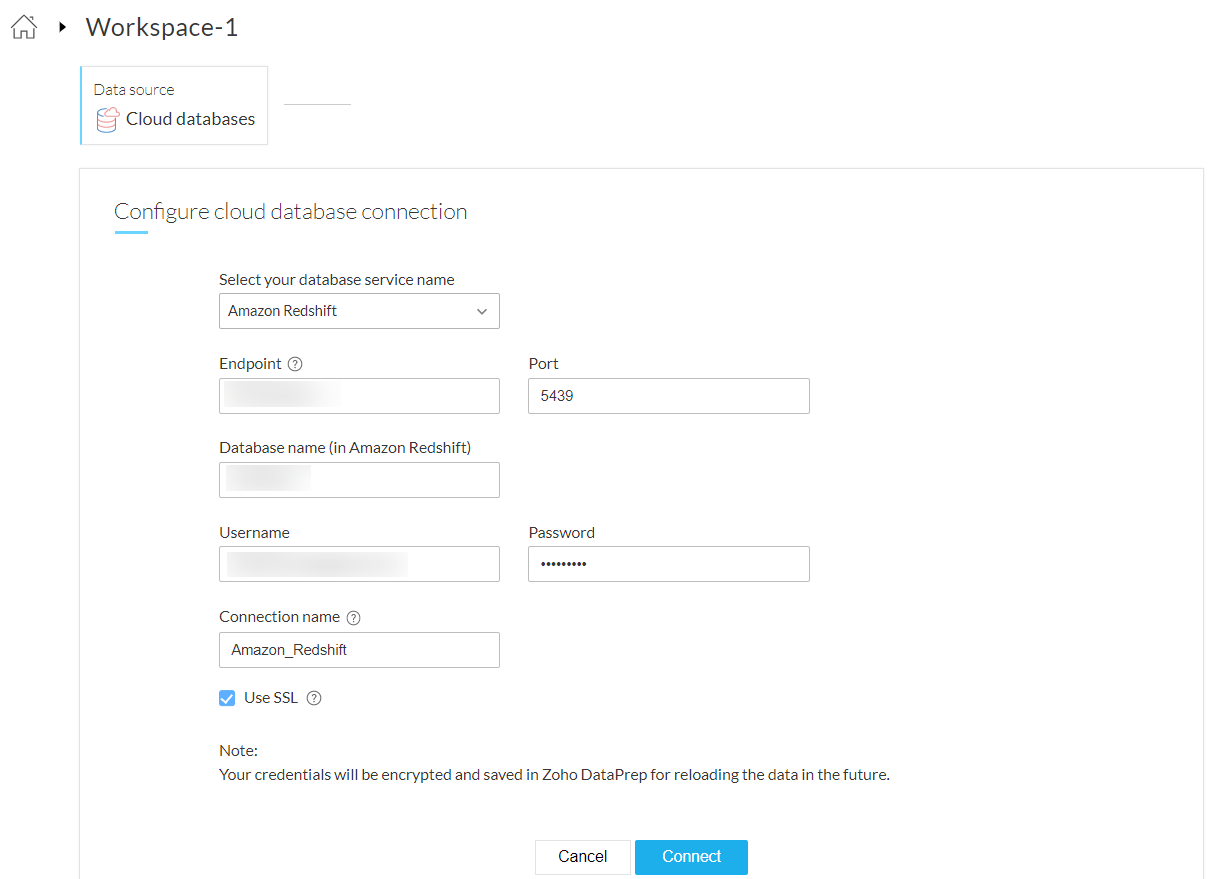 Zoho DataPrep supports importing data from Amazon Redshift, a cloud database. It is a fully managed, petabyte-scale data warehouse service in the cloud.