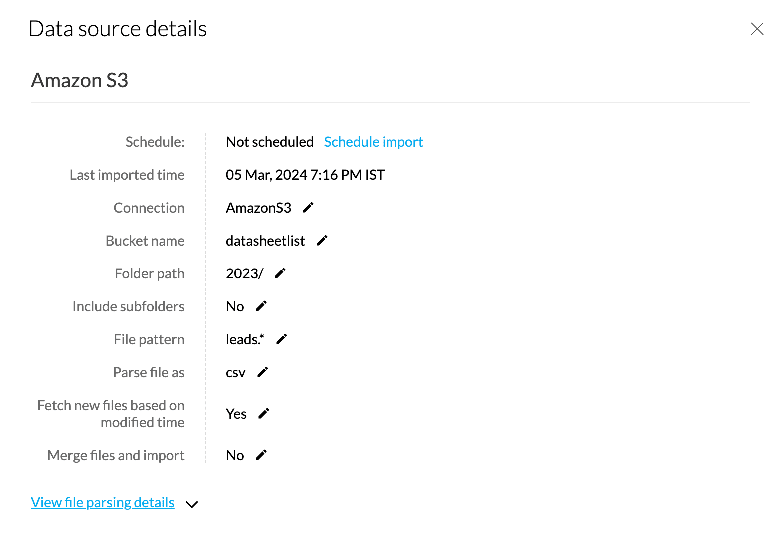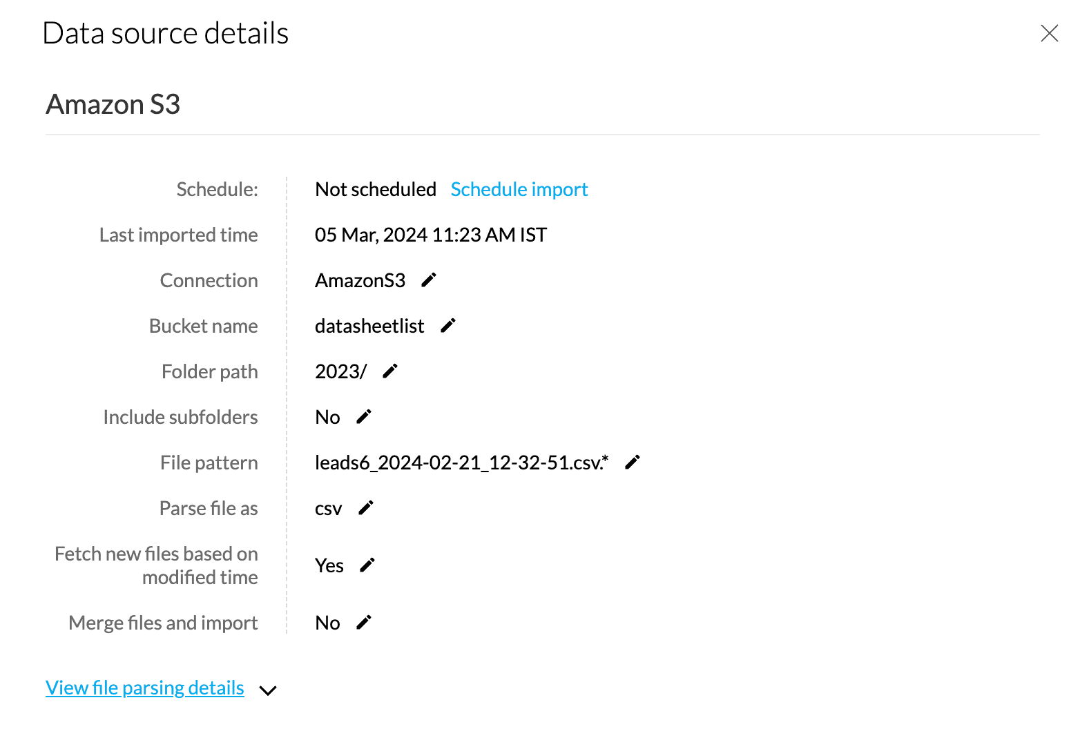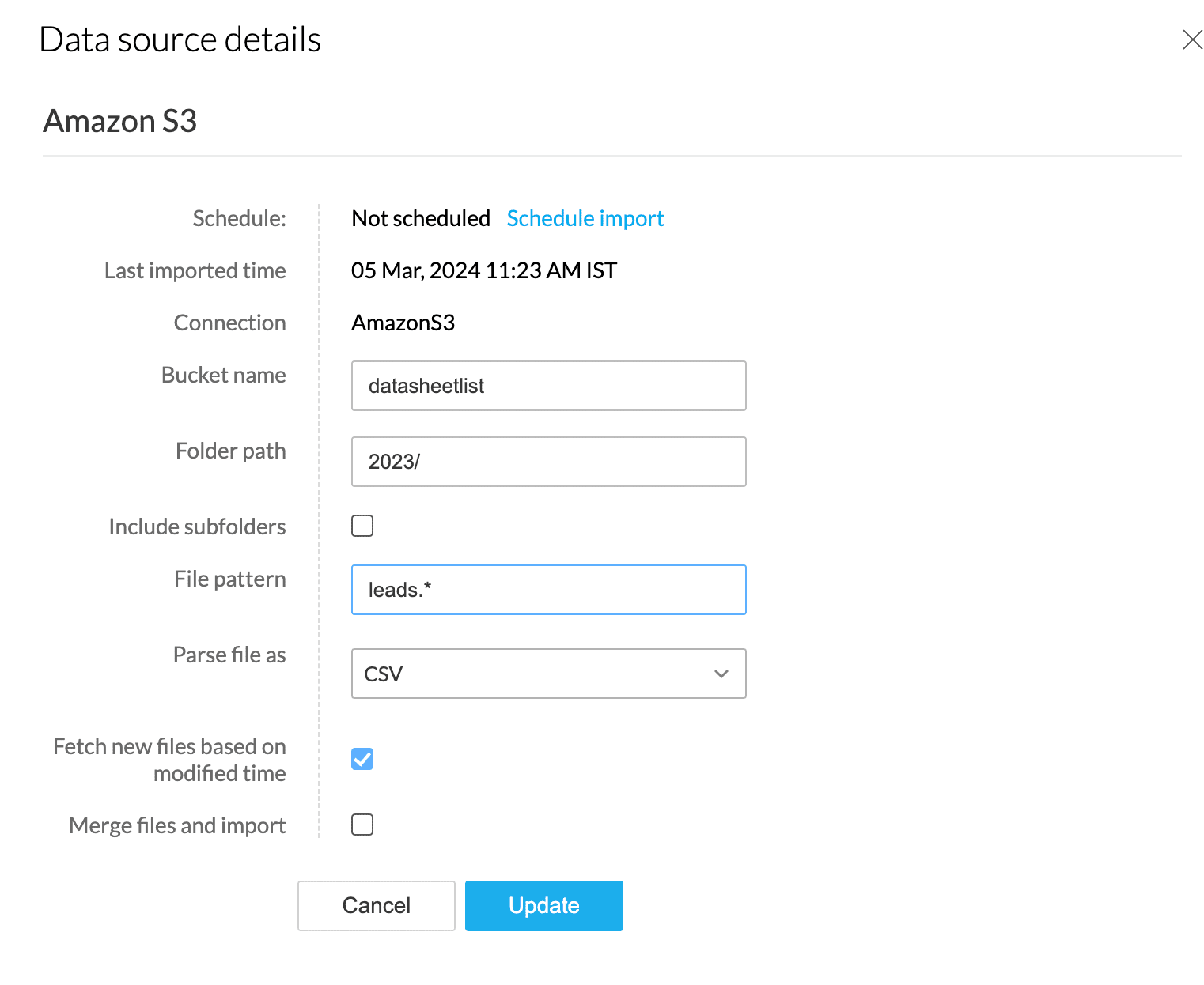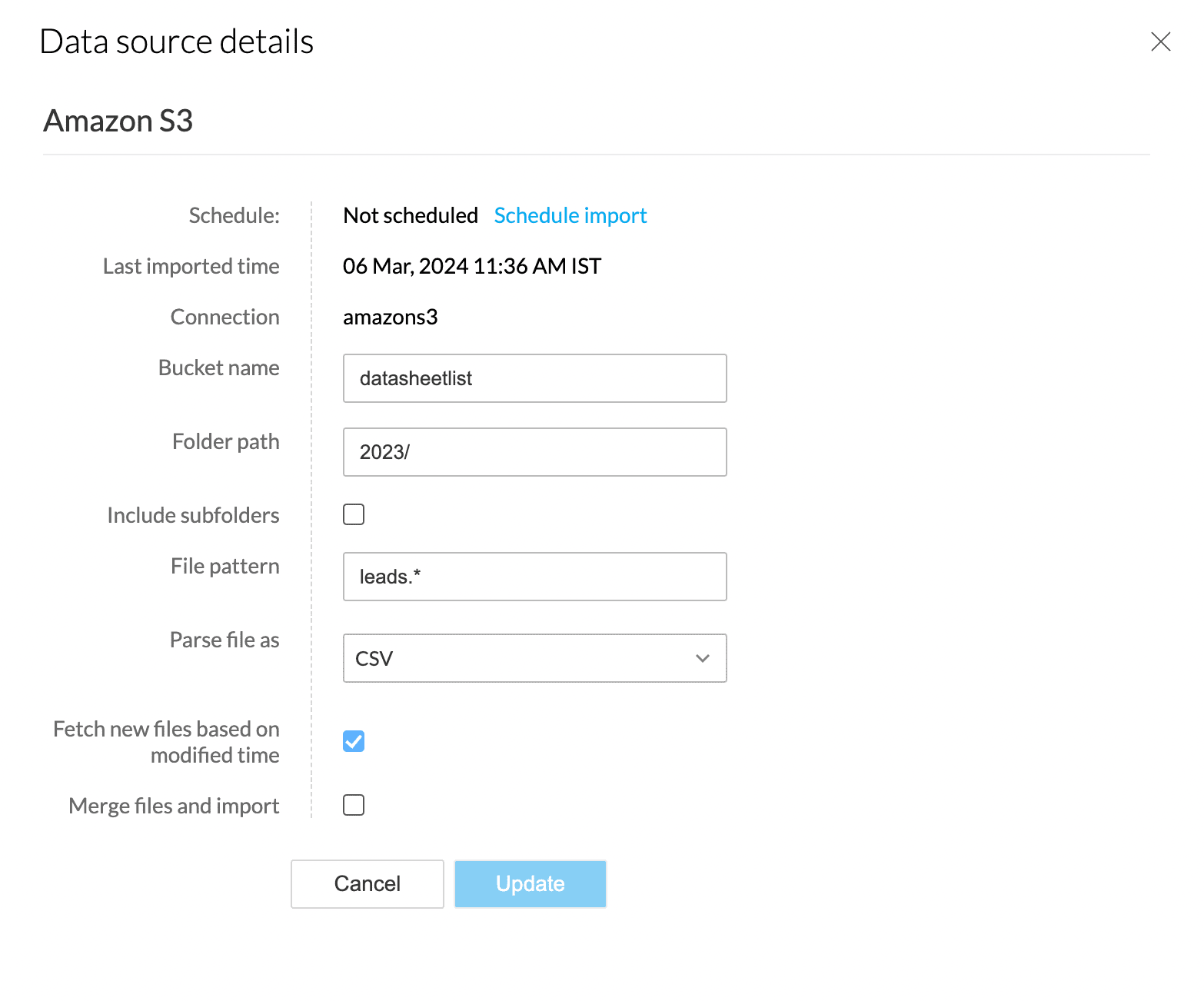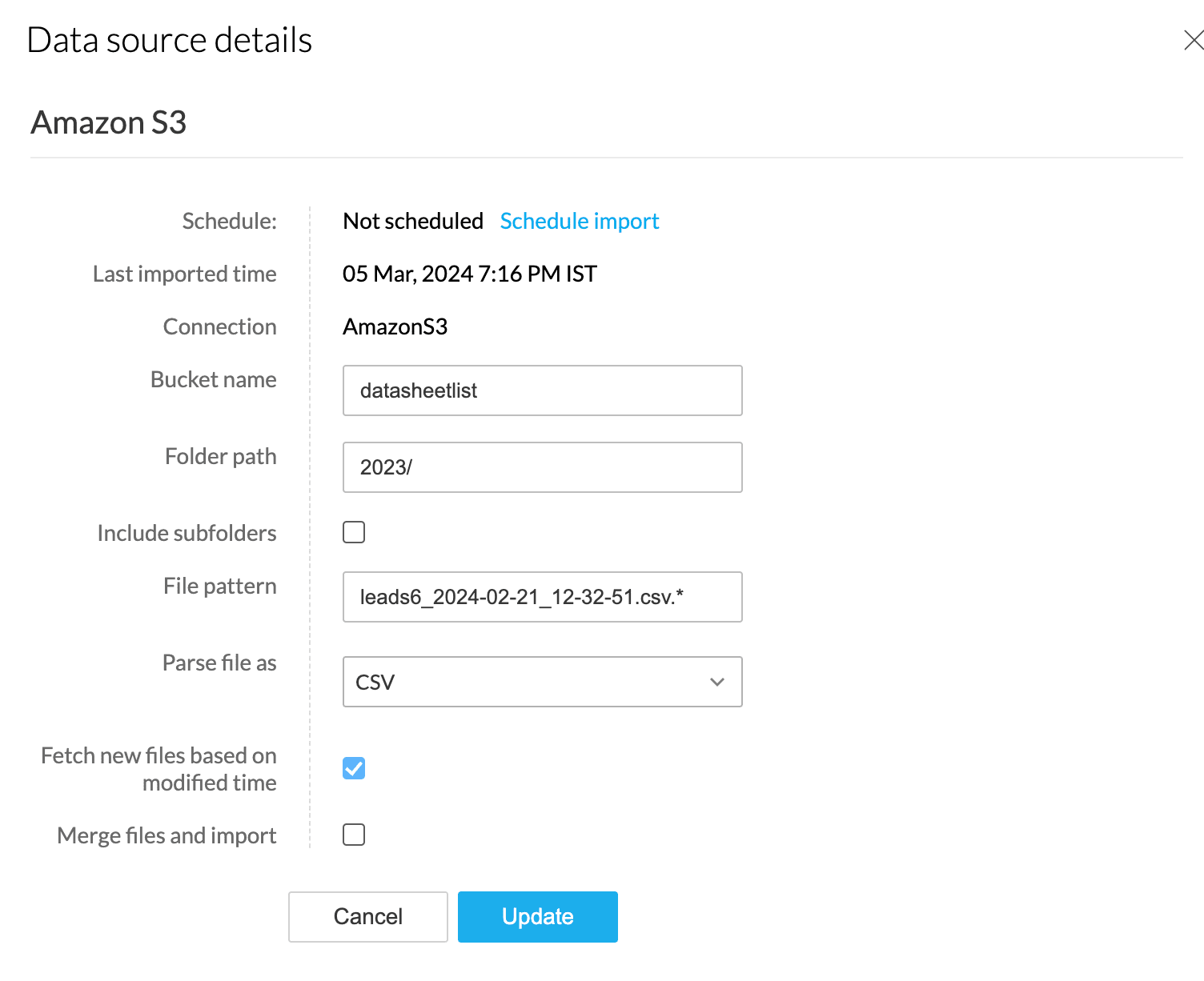 8) In the data source details page, enter the specific file pattern from where you want to import next in the File patternfield. Click Update. Eg leads6_2024-02-21_12-32-51.csv.*