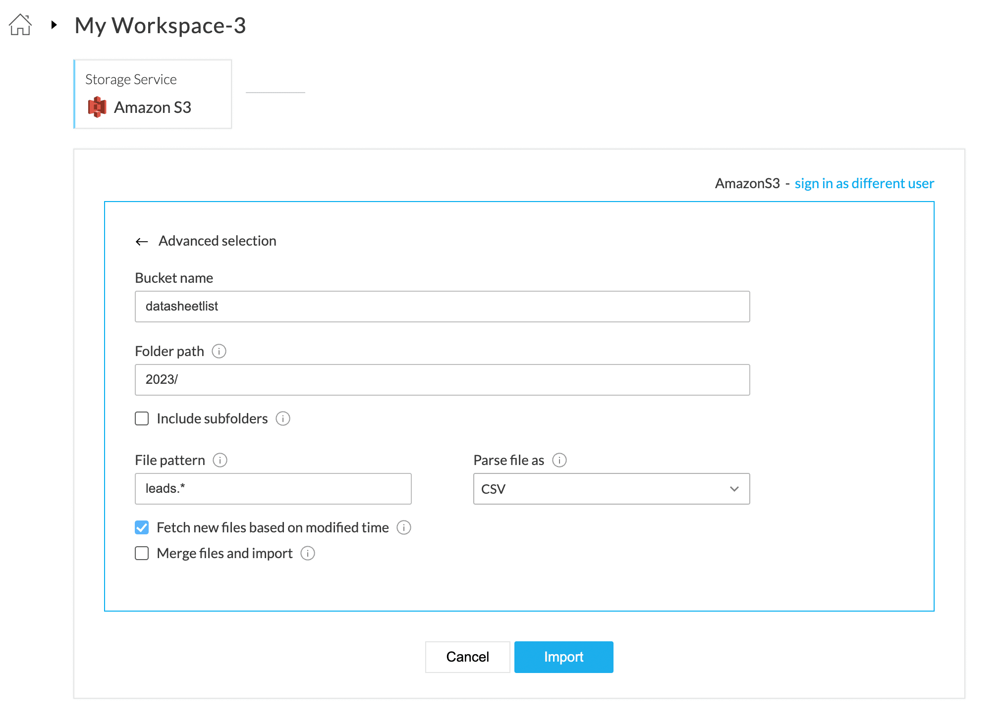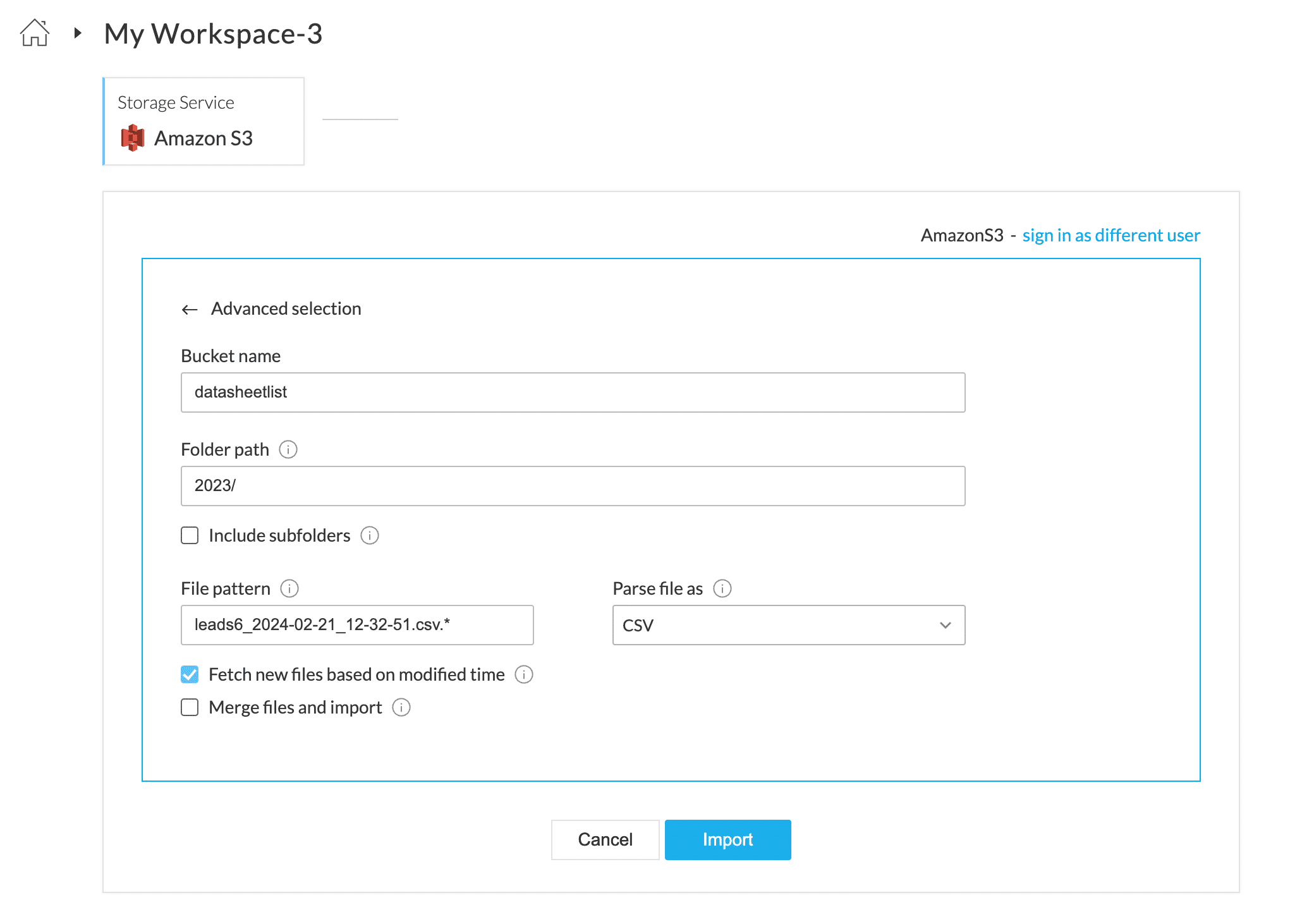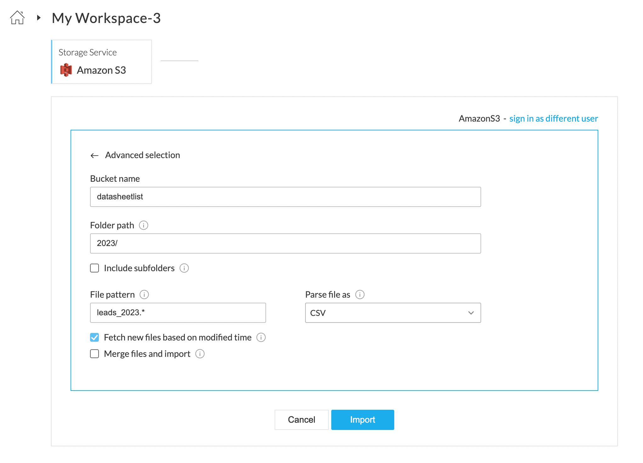 Advanced selection helps you perform dynamic file selection based on regex. This can be used for getting new or incremental data from your Amazon S3 bucket. The newly added or modified file that matches the file pattern after the previous sync will be taken from your S3 bucket.