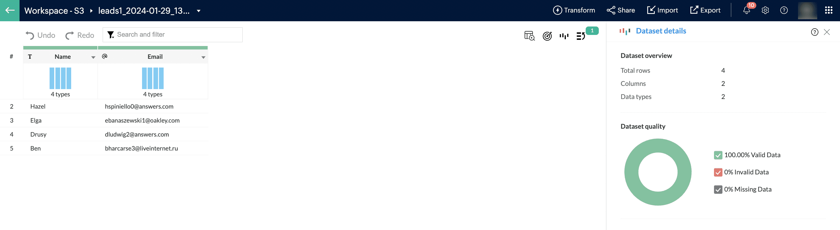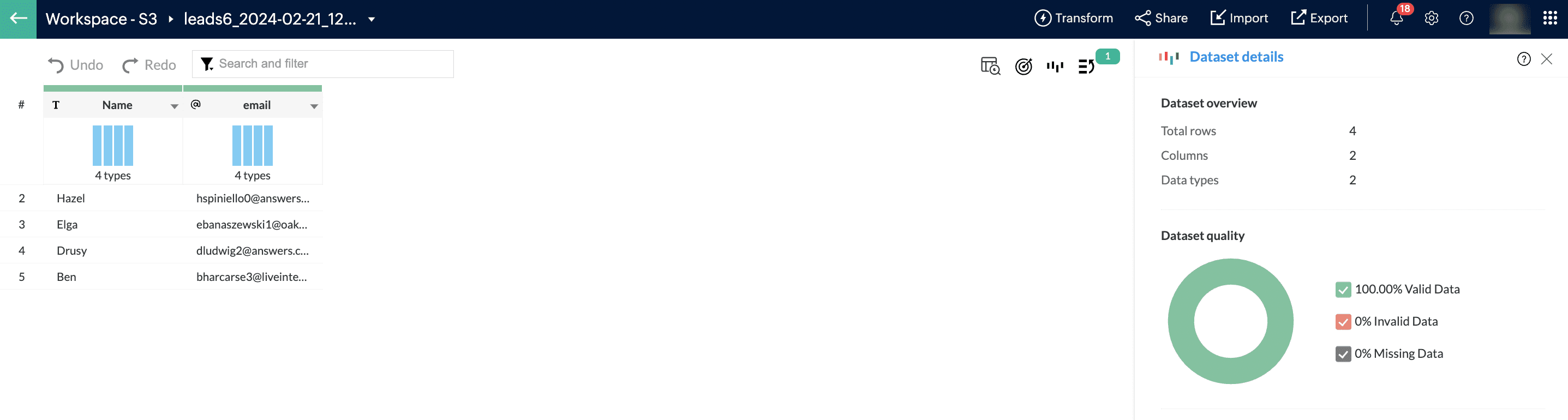 7. Once you have completed importing data, your dataset will open and you can start preparing your data right away.
