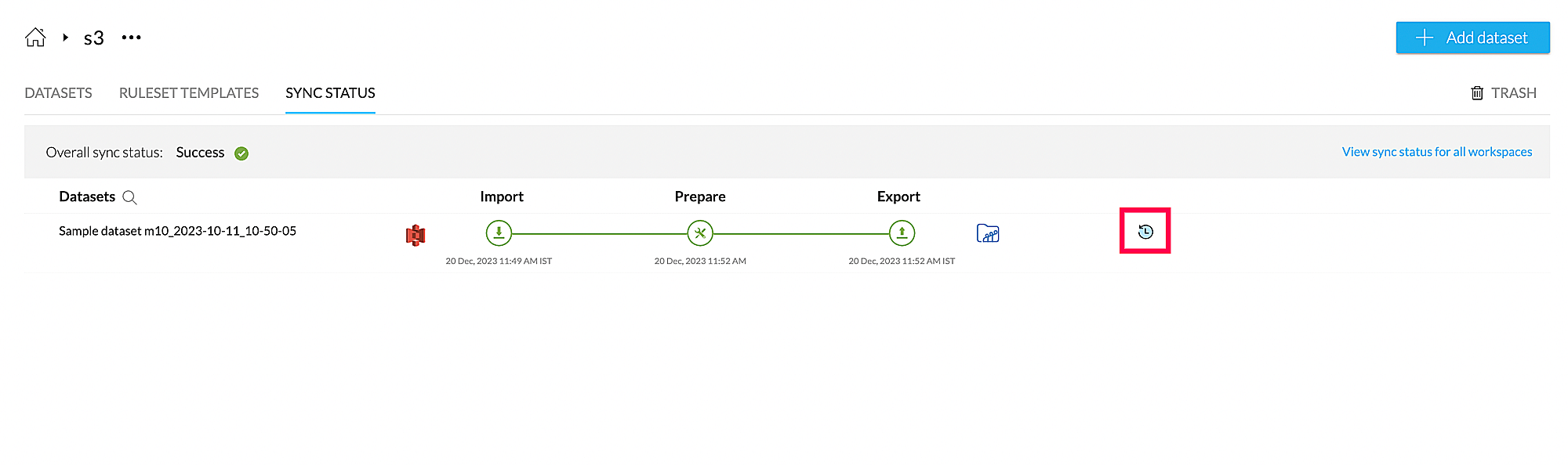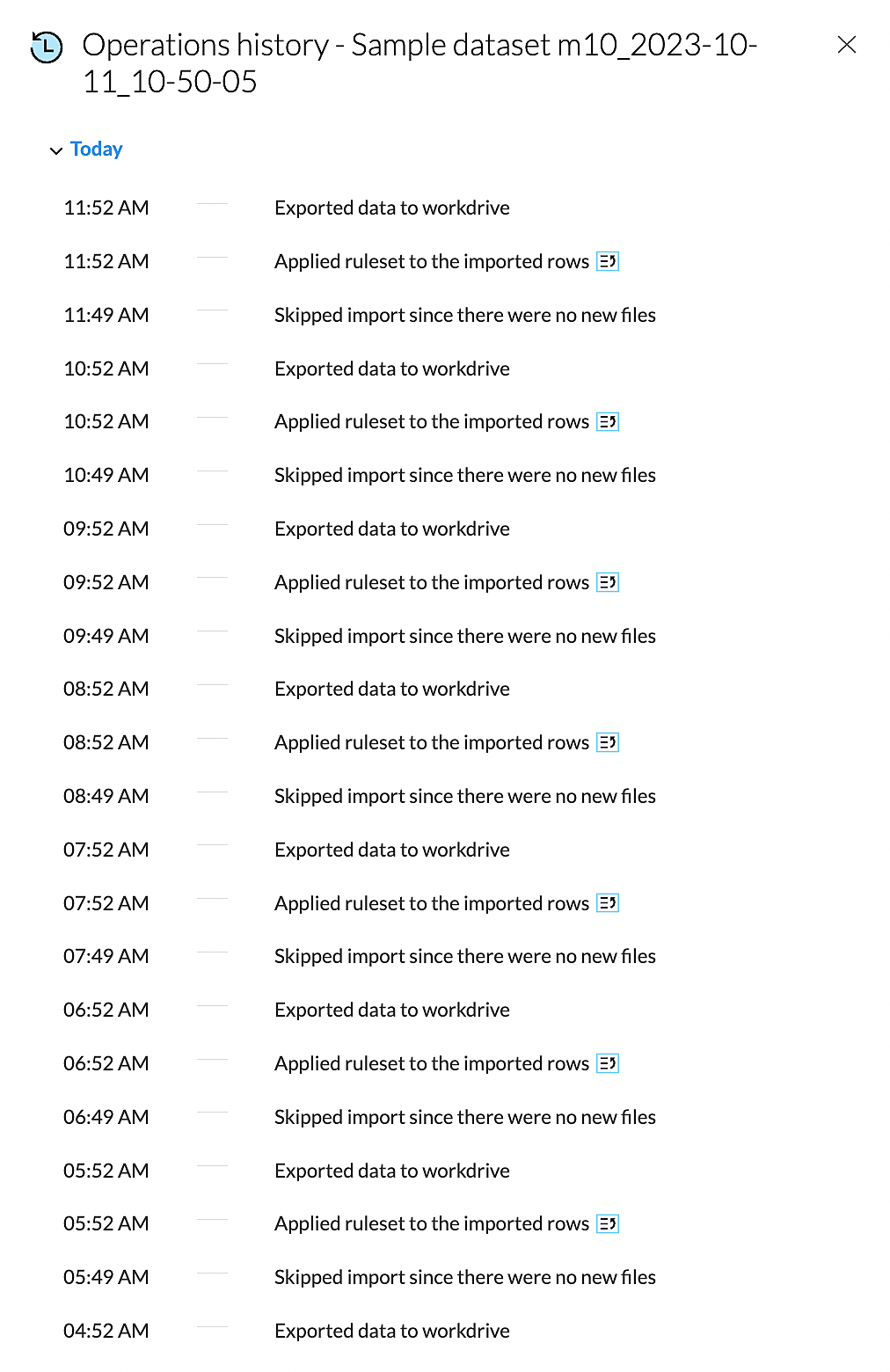Click the Operations history icon near each sync status to view and track the changes made to the dataset, its previous states, the import and export schedules in a timeline.