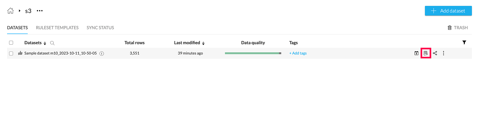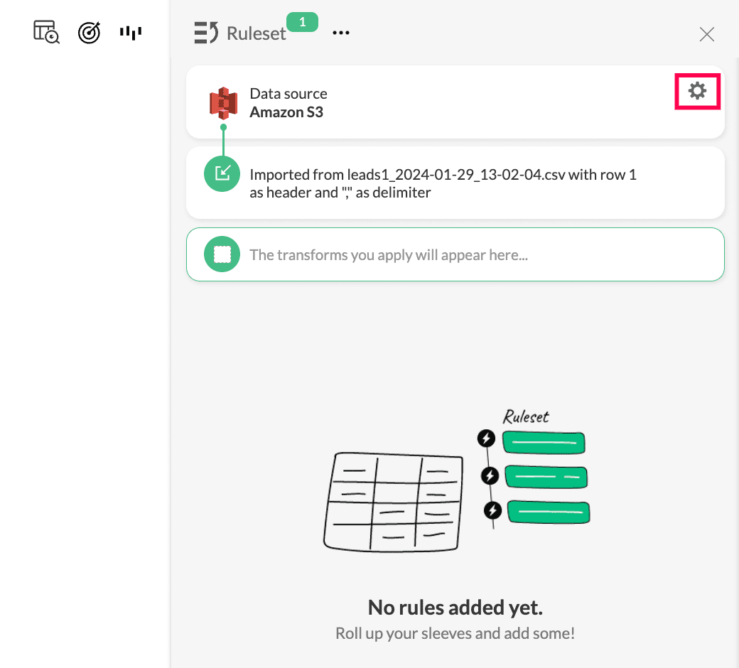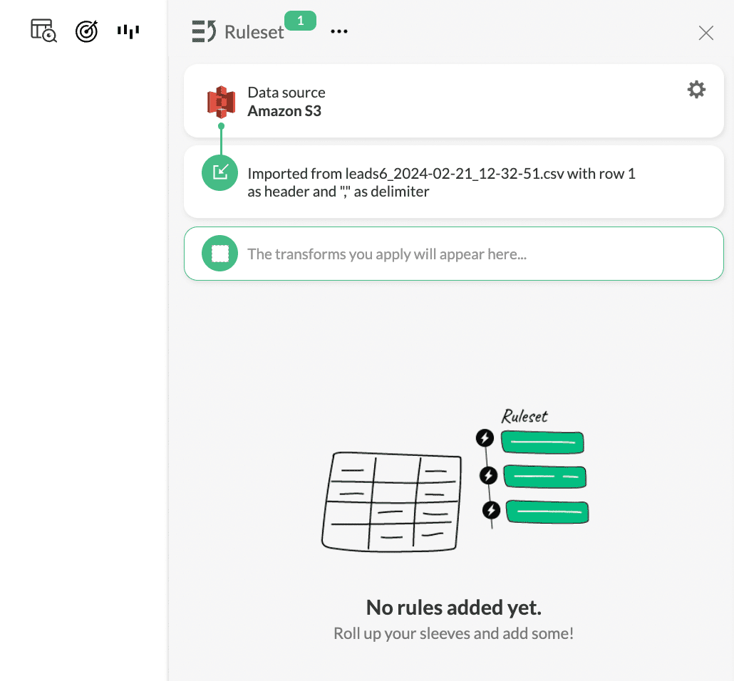 4. Click the ruleset icon in the top-right corner of the DataPrep Studio page to view the Ruleset pane.