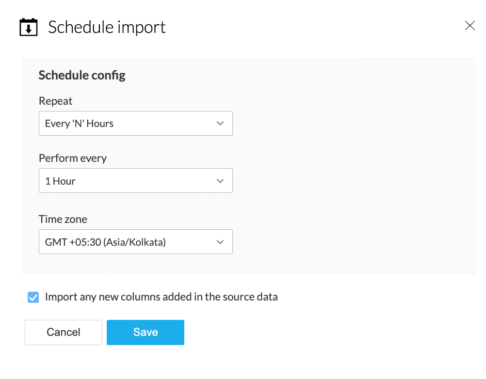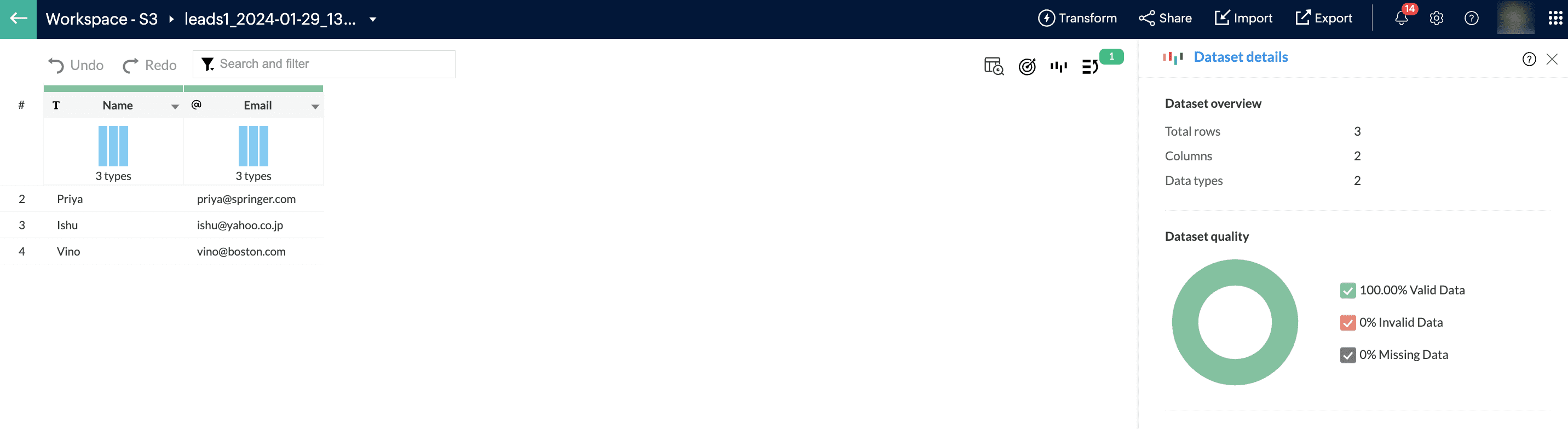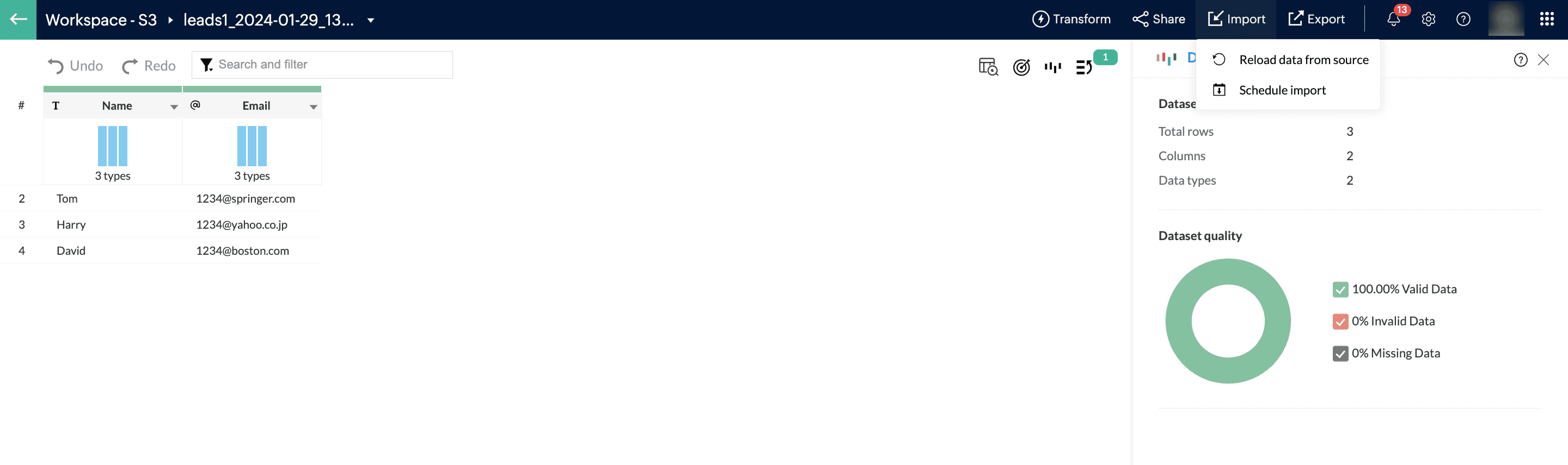 Note: You can choose to schedule the import using the Schedule import option available for datasets in your workspace or from the Import menu in the top bar of the DataPrep Studio page. Click here to know more.