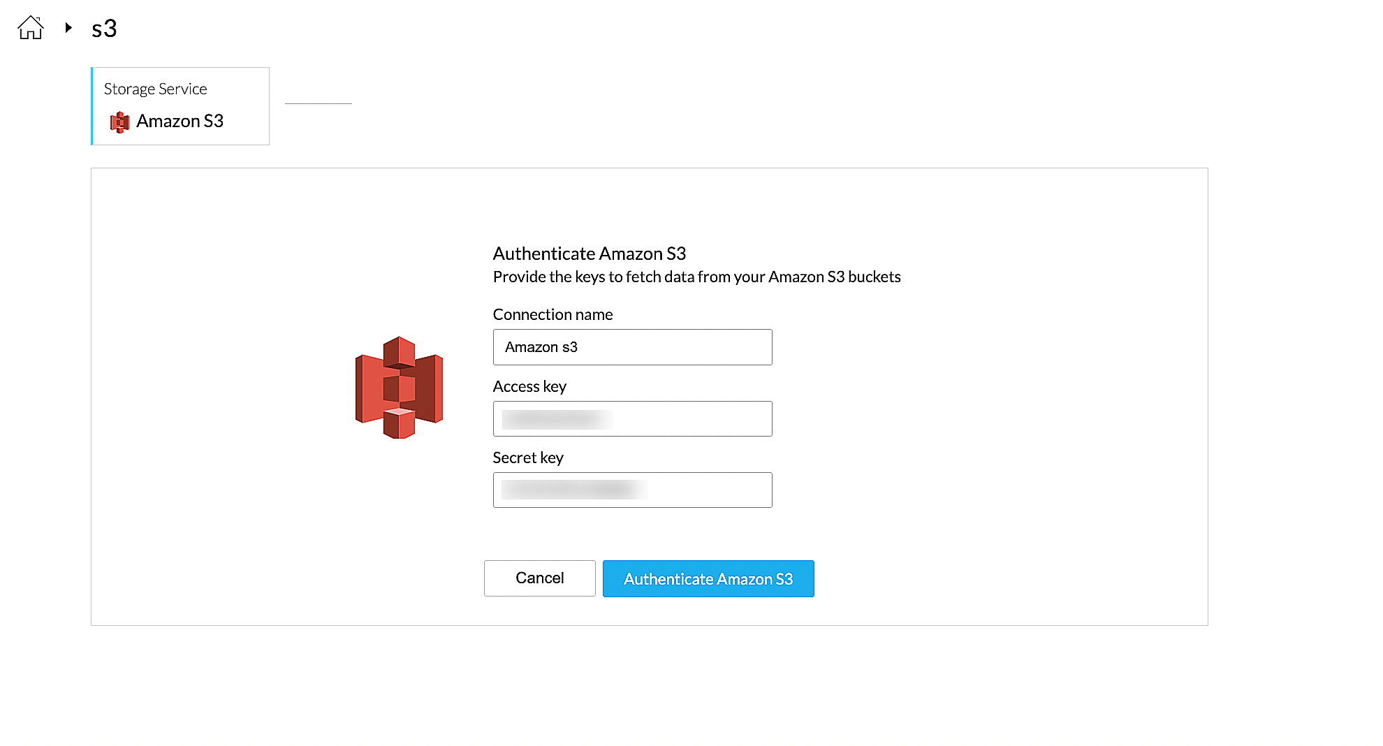 5. Click the Authenticate Amazon S3 button to authenticate your account with your credentials. You will need to authenticate S3 when you try importing data for the first time.