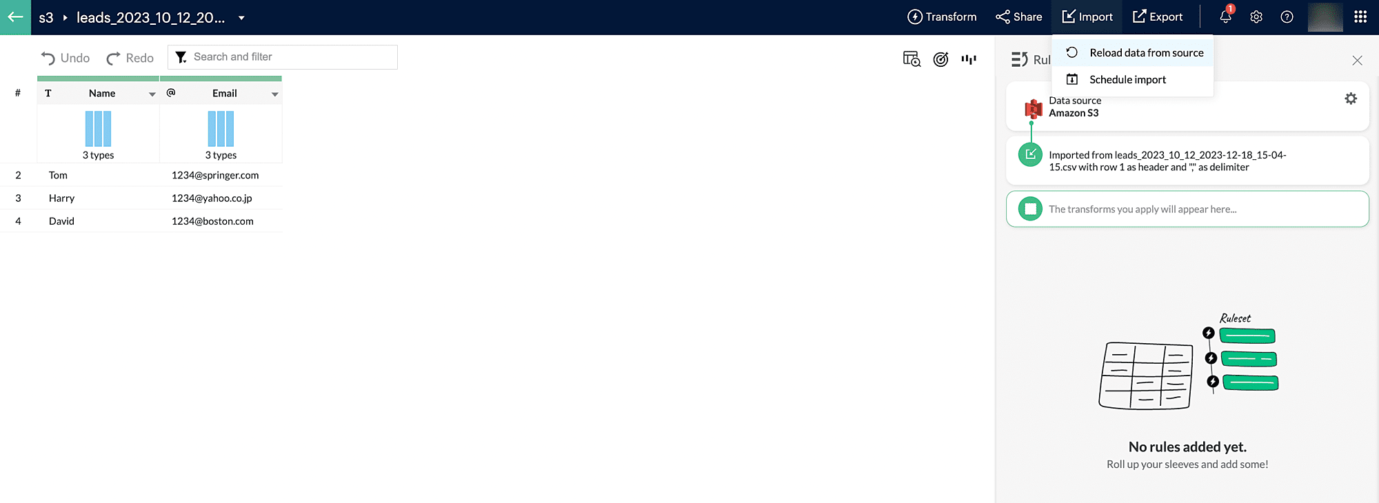 4) From the DataPrep studio page, select the Import menu in the top bar and click Reload data from source.