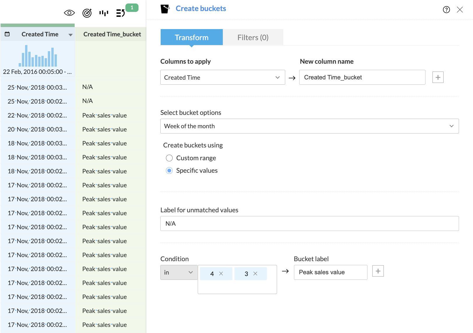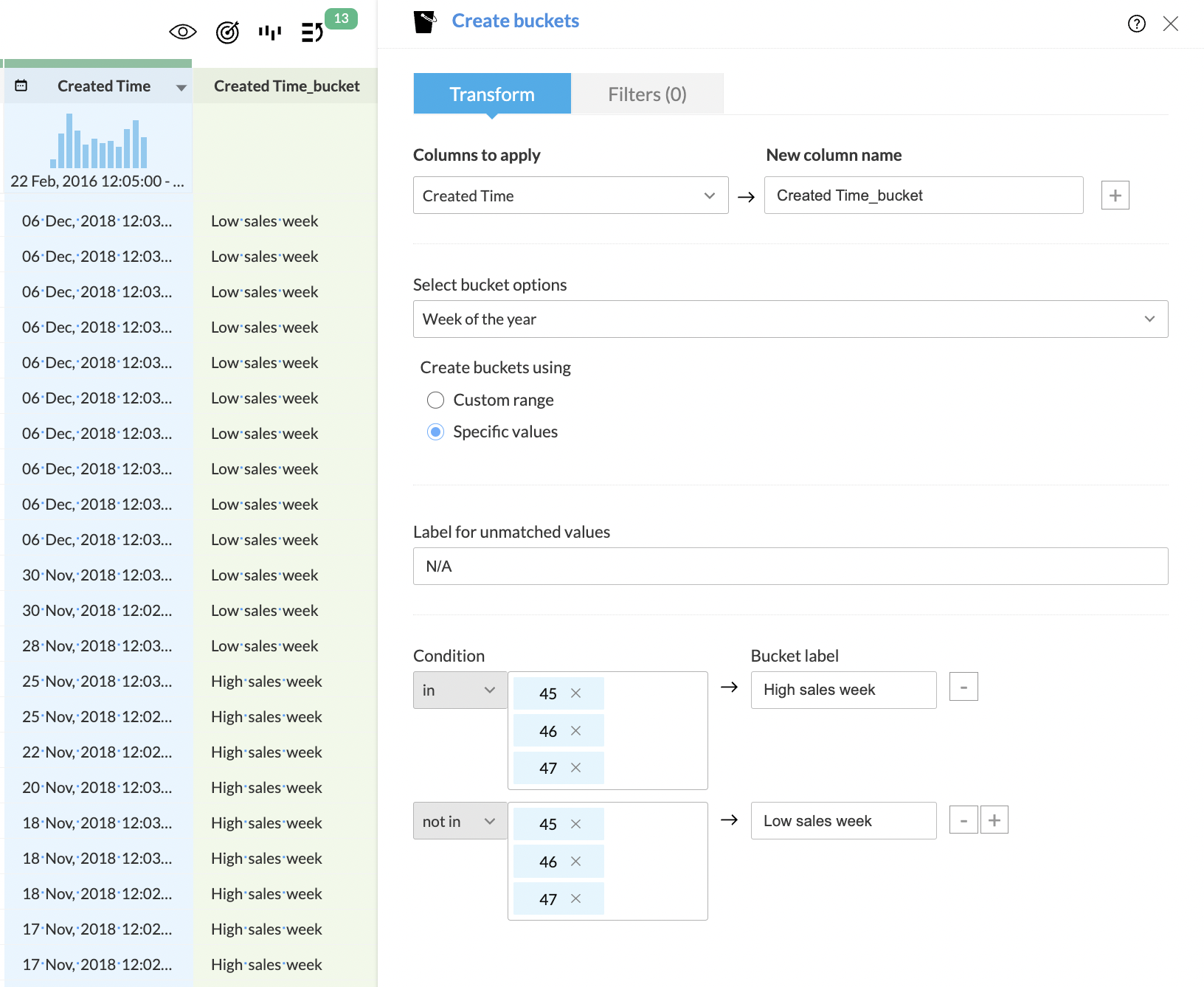 option, select the "In" condition and enter the week numbers, e.g.- 45, 46, 47. Enter the Bucket label as "High sales week" and click apply.