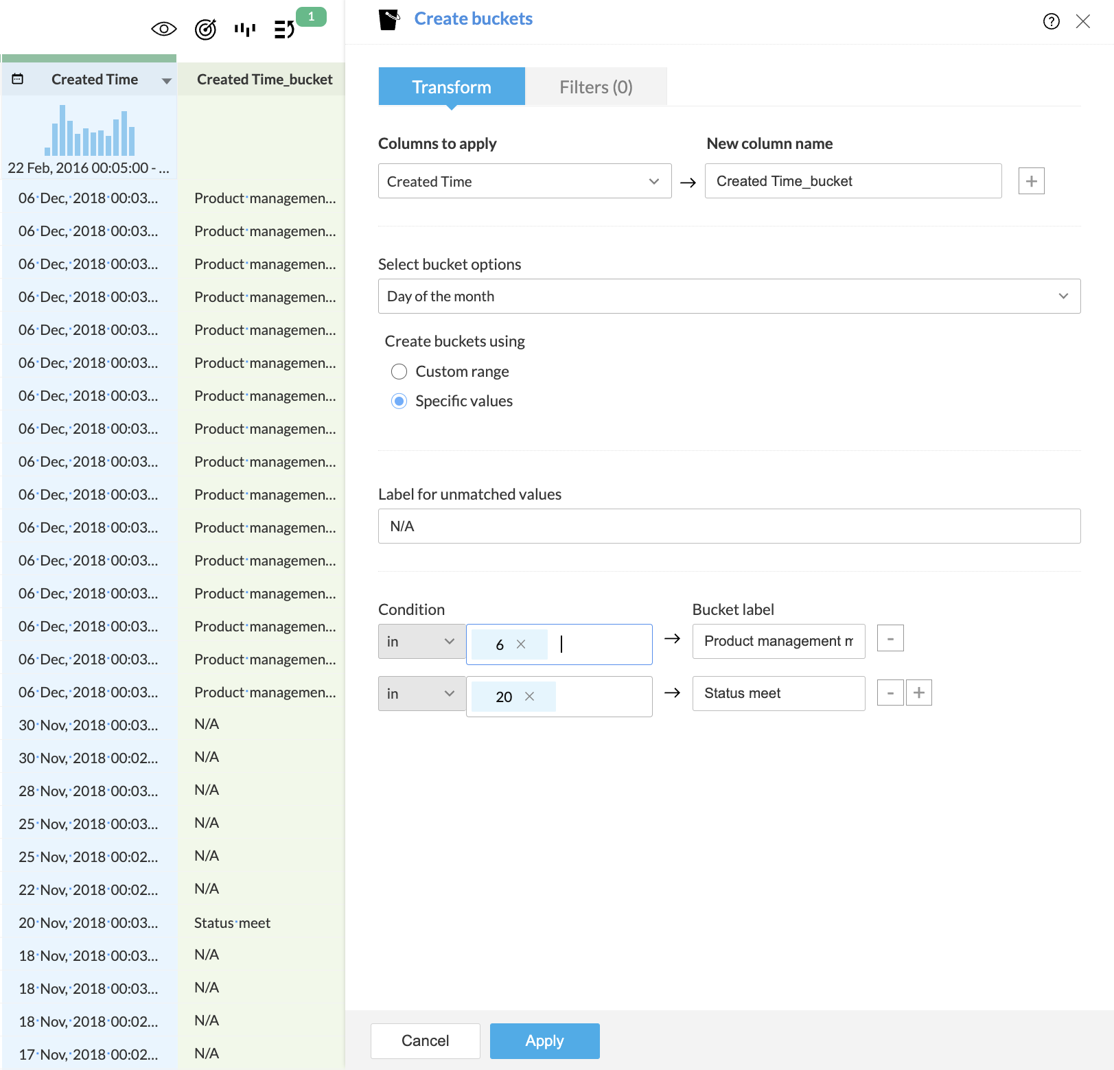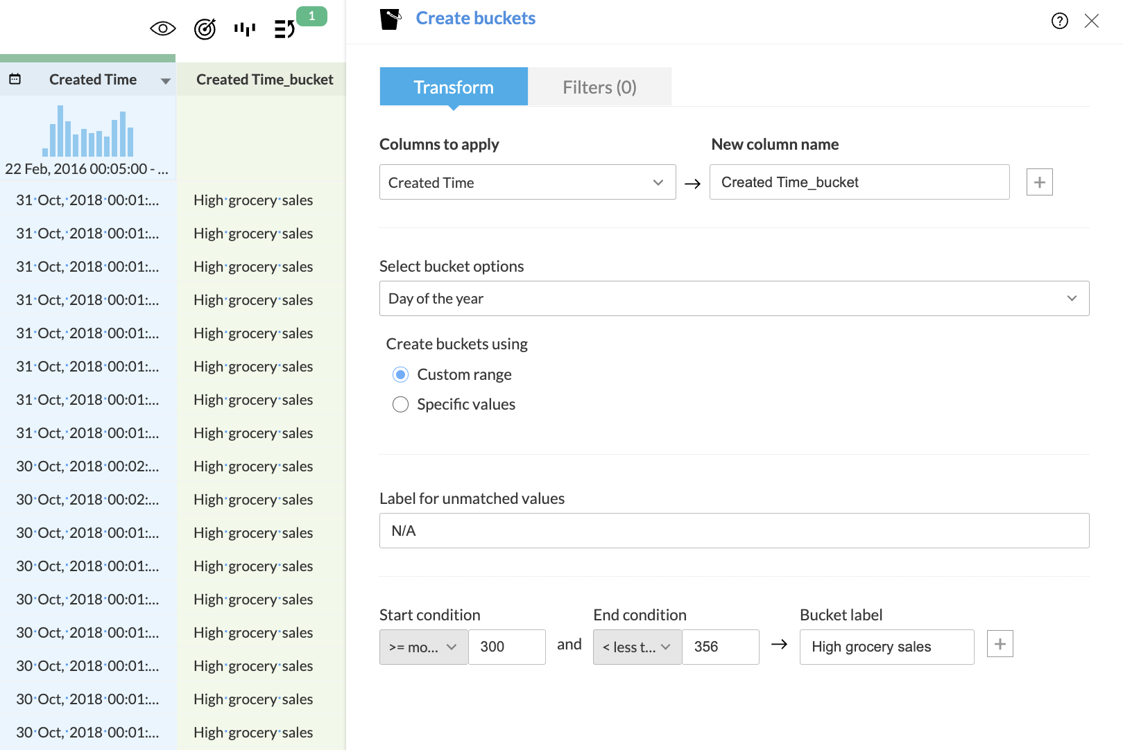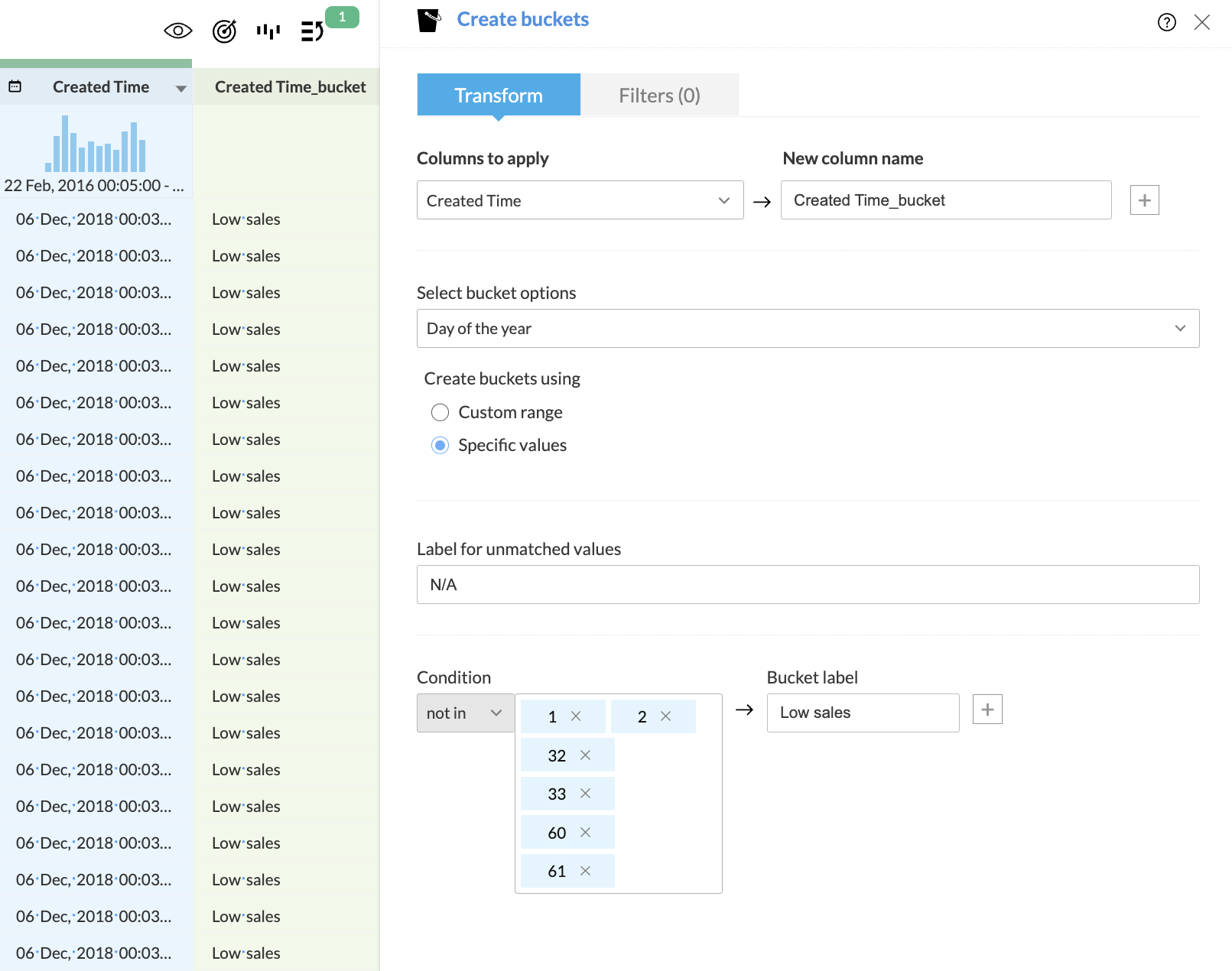 For example, if you want to bucket the months based on a season like Autumn, enter the months with the condition "in" and enter the label name under Bucket label as "Autumn" and click