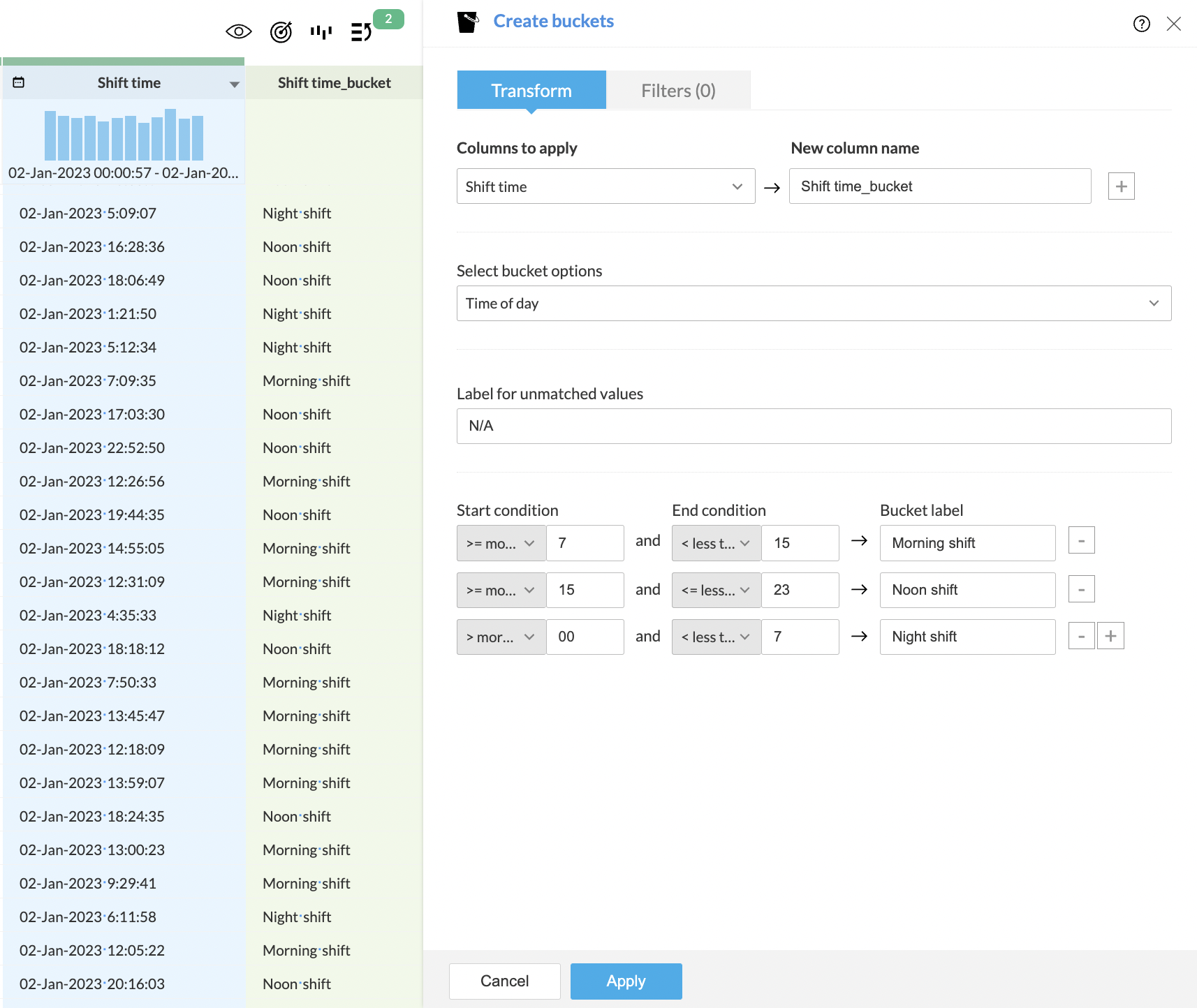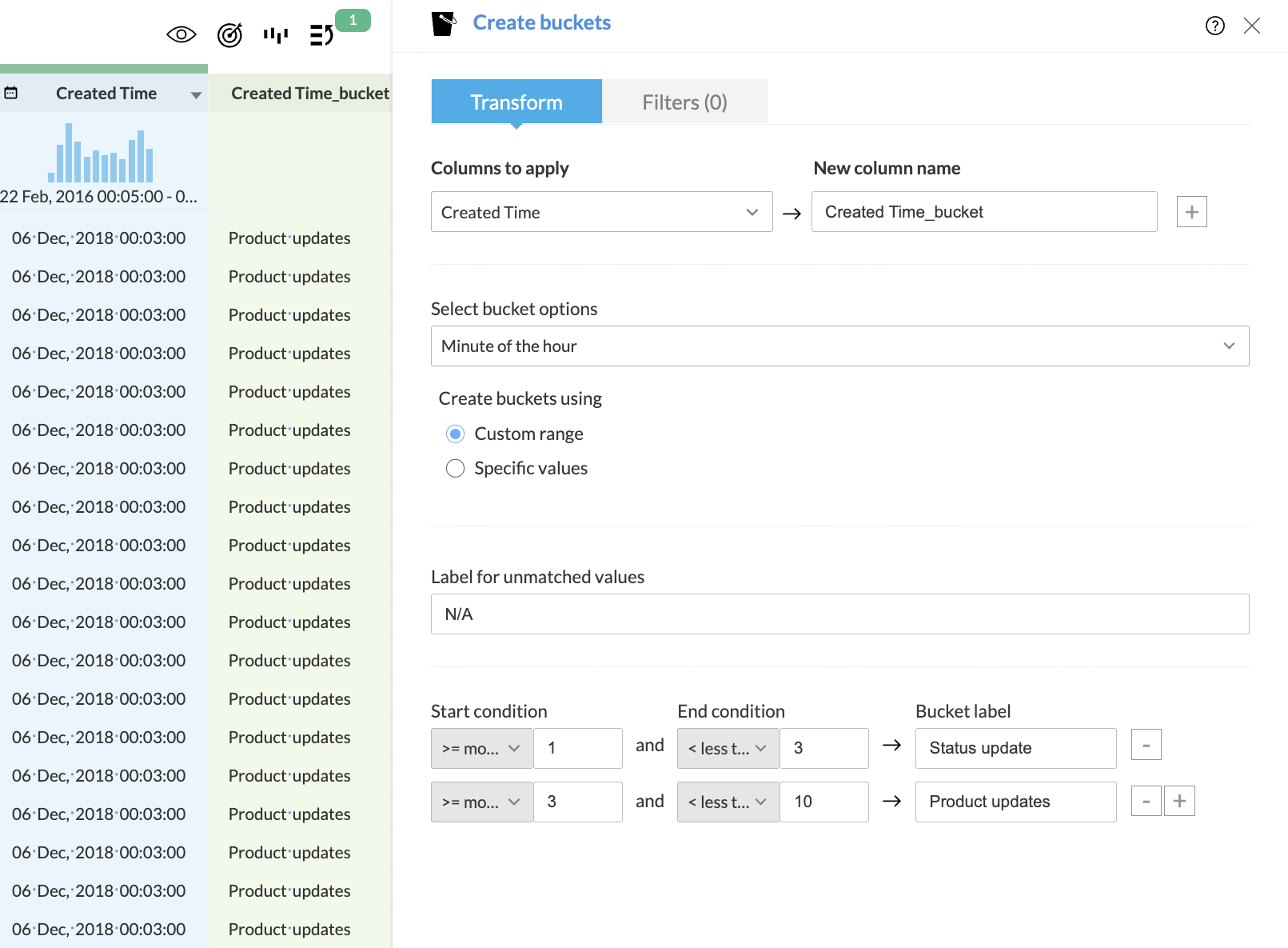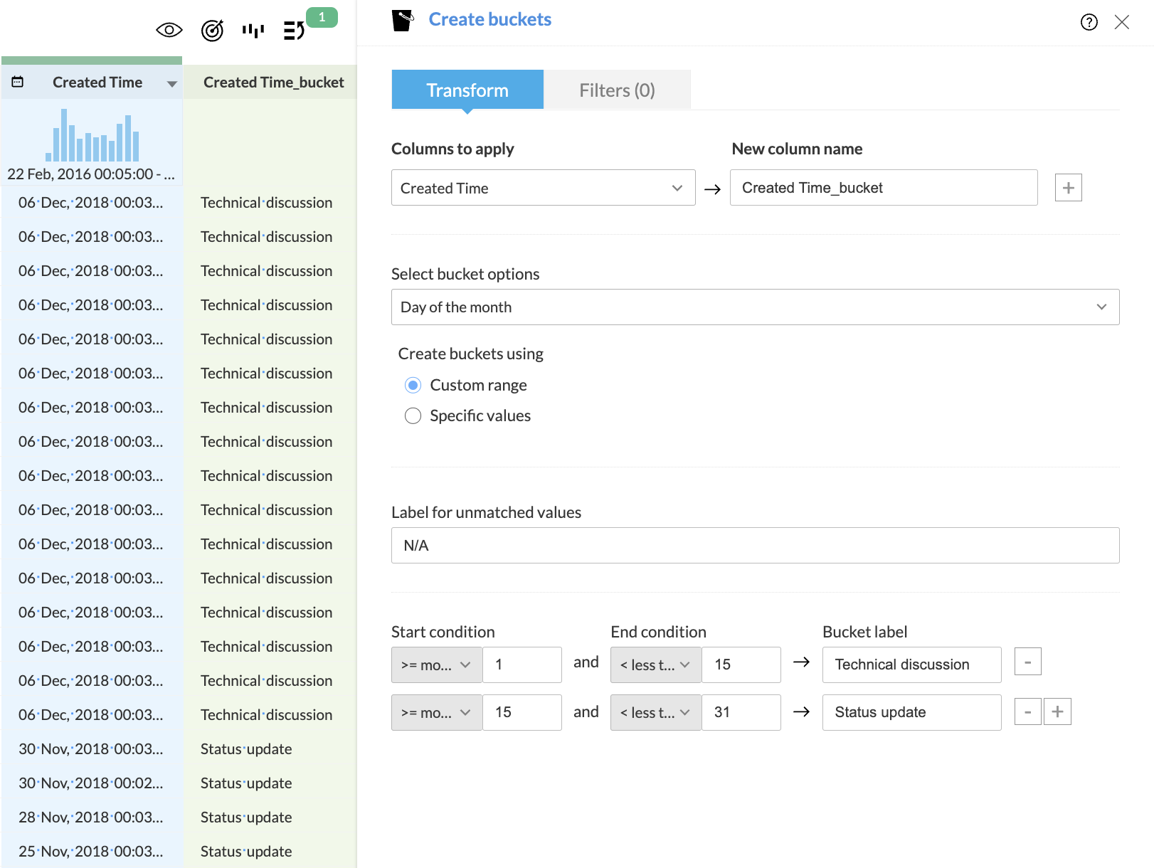 For example, if you want to bucket the months based on a season like Autumn, enter the months with the condition "in" and enter the label name under Bucket label as "Autumn" and click