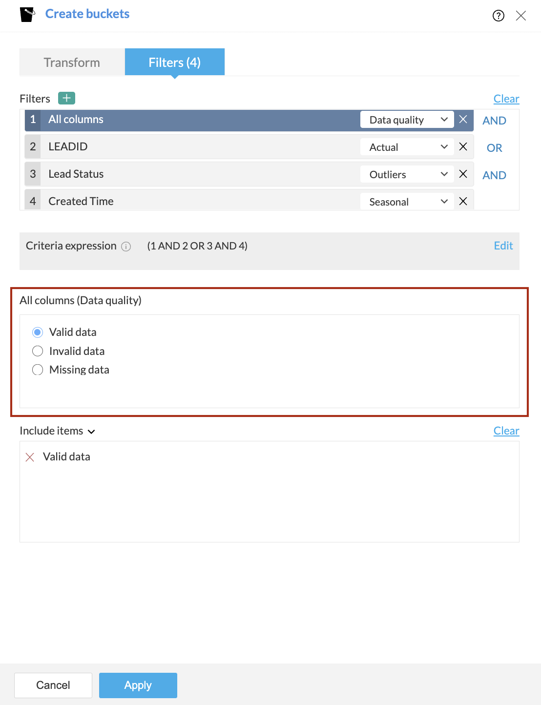 Data quality: This option lets you filter rows based on the quality of data in the column. Click