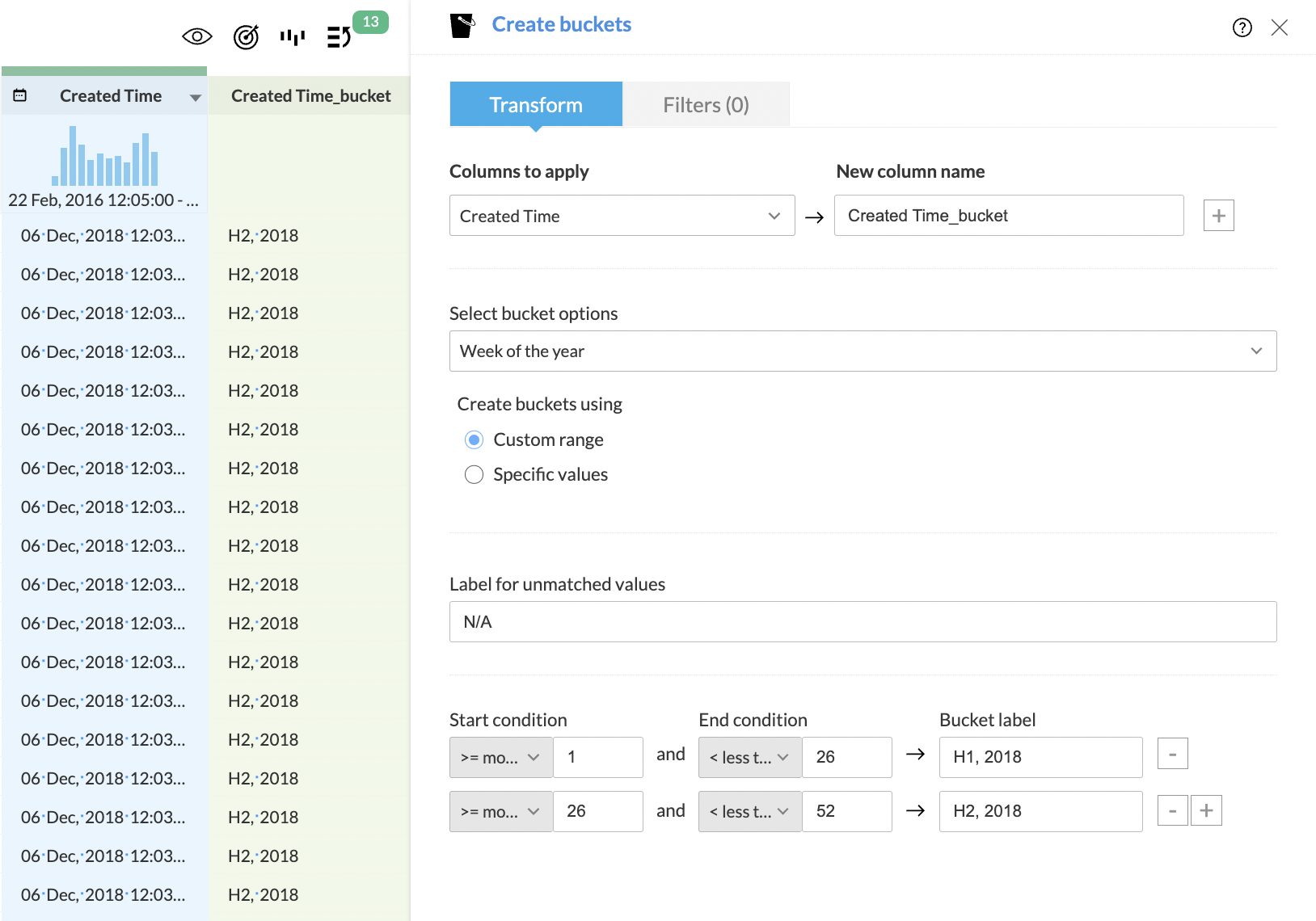 The end condition will be less than or equal to 26 (26th week). Enter "H1, 2018" as the bucket label.