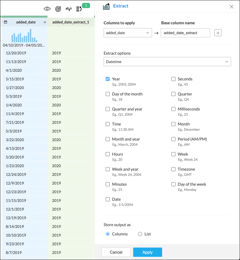 DataPrep provides various options to extract part of date values into a new column. The portions which can be extracted are: