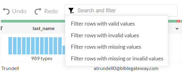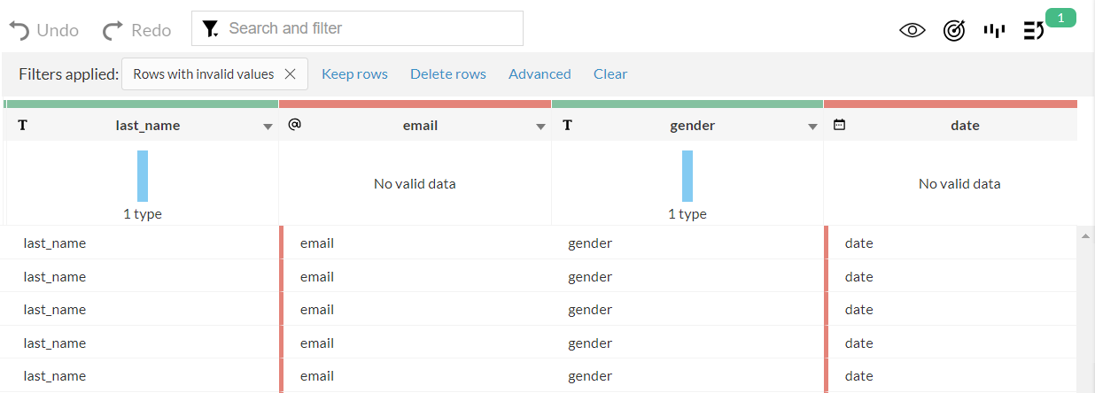 - Filter rows with invalid values - Only rows with invalid data are displayed