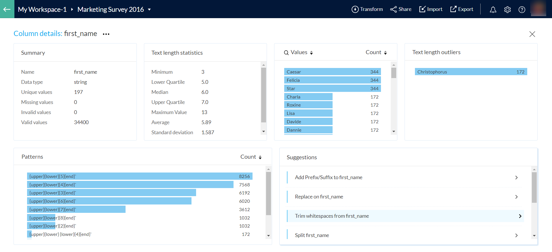 DataPrep suggests transforms based on the imported data and makes for effective data preparation. Suggestions are shown when one or multiple columns are selected, it is also shown when a filter is applied.