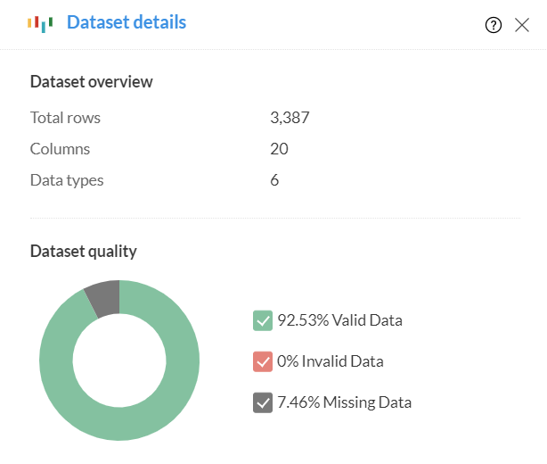 Dataset details reveal data quality for the entire dataset using a donut chart. The number is derived from the collective quality of the individual columns. You will see this section for the first time when a dataset loads onto the data preparation screen, and whenever none of the columns are selected.
