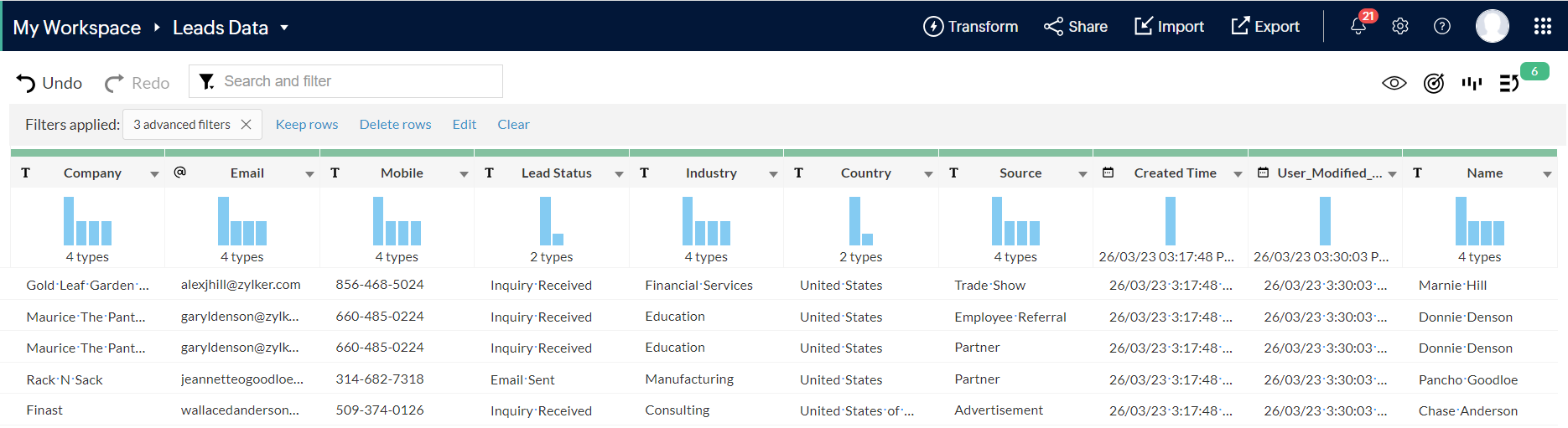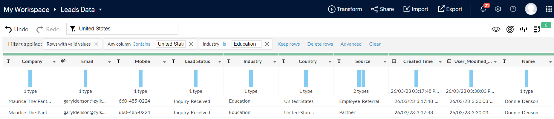 Perform search operations and filter data using the Search and filter box. The search and filter box is exploratory in nature and provides a way to filter your dataset without applying them as a rule. However, you can choose to apply them as a rule by either keeping or deleting the filtered rows.