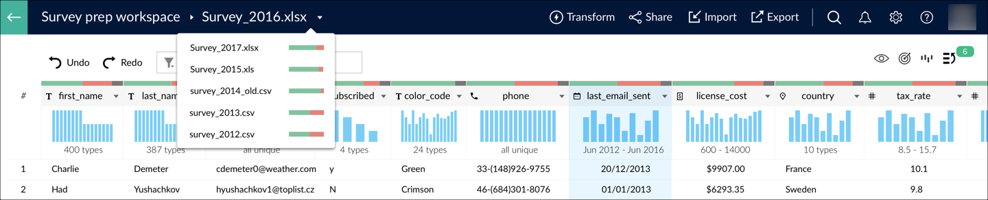 You can also use this dropdown to take a look at the data quality of other datasets. This helps you prioritize data preparation activities in the workspace.