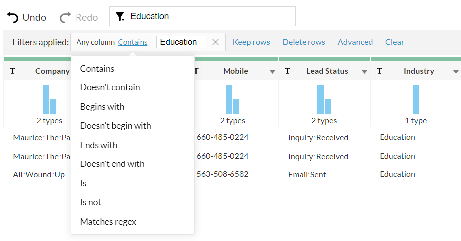 The Advanced filters option allows you to filter data based on custom conditions applied over one or more columns. The advanced filters is exploratory in nature and provides a way to filter your dataset without applying them as a rule. However, you can choose to apply them as a rule by either keeping or deleting the filtered rows. The Advanced link appears once you filter data.