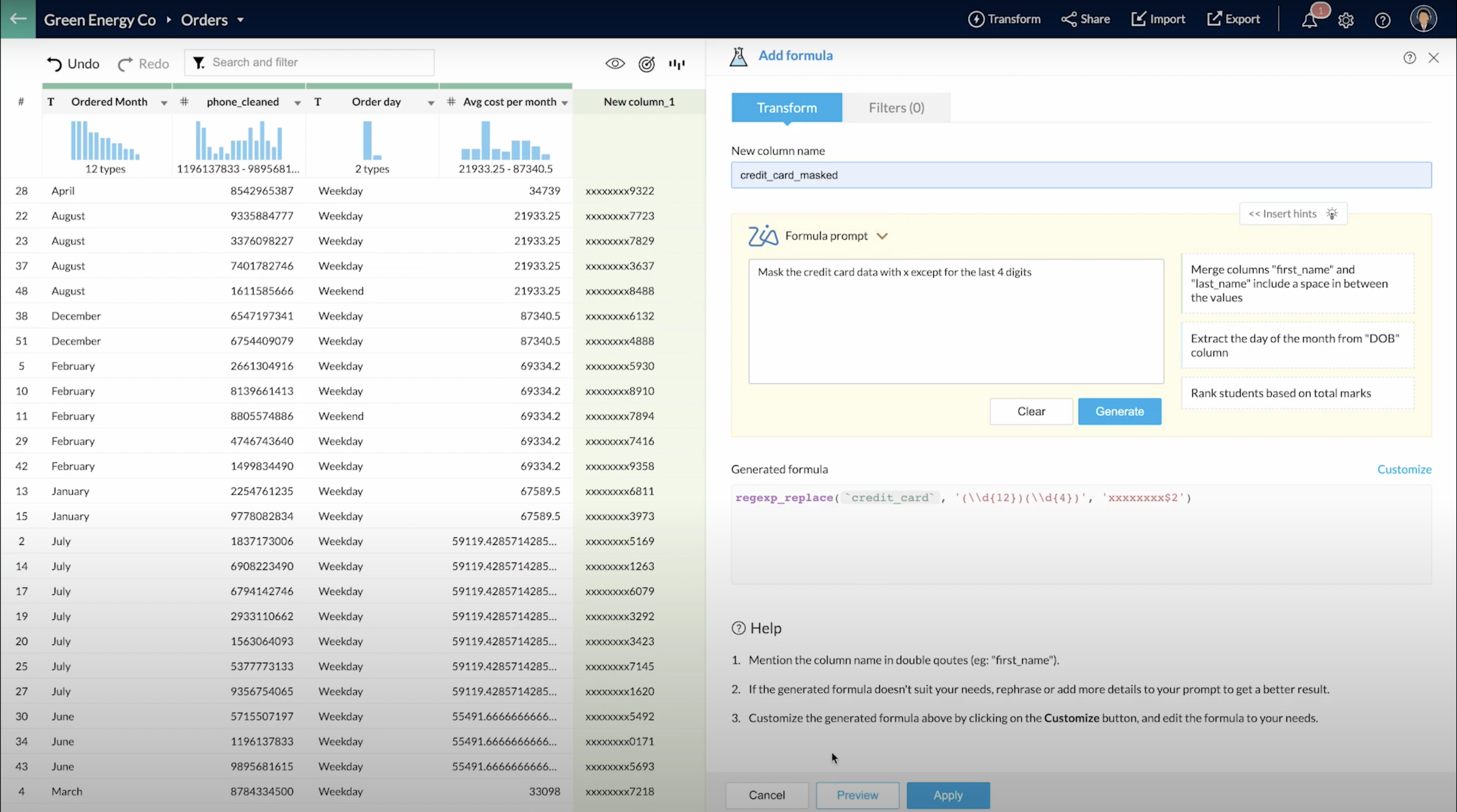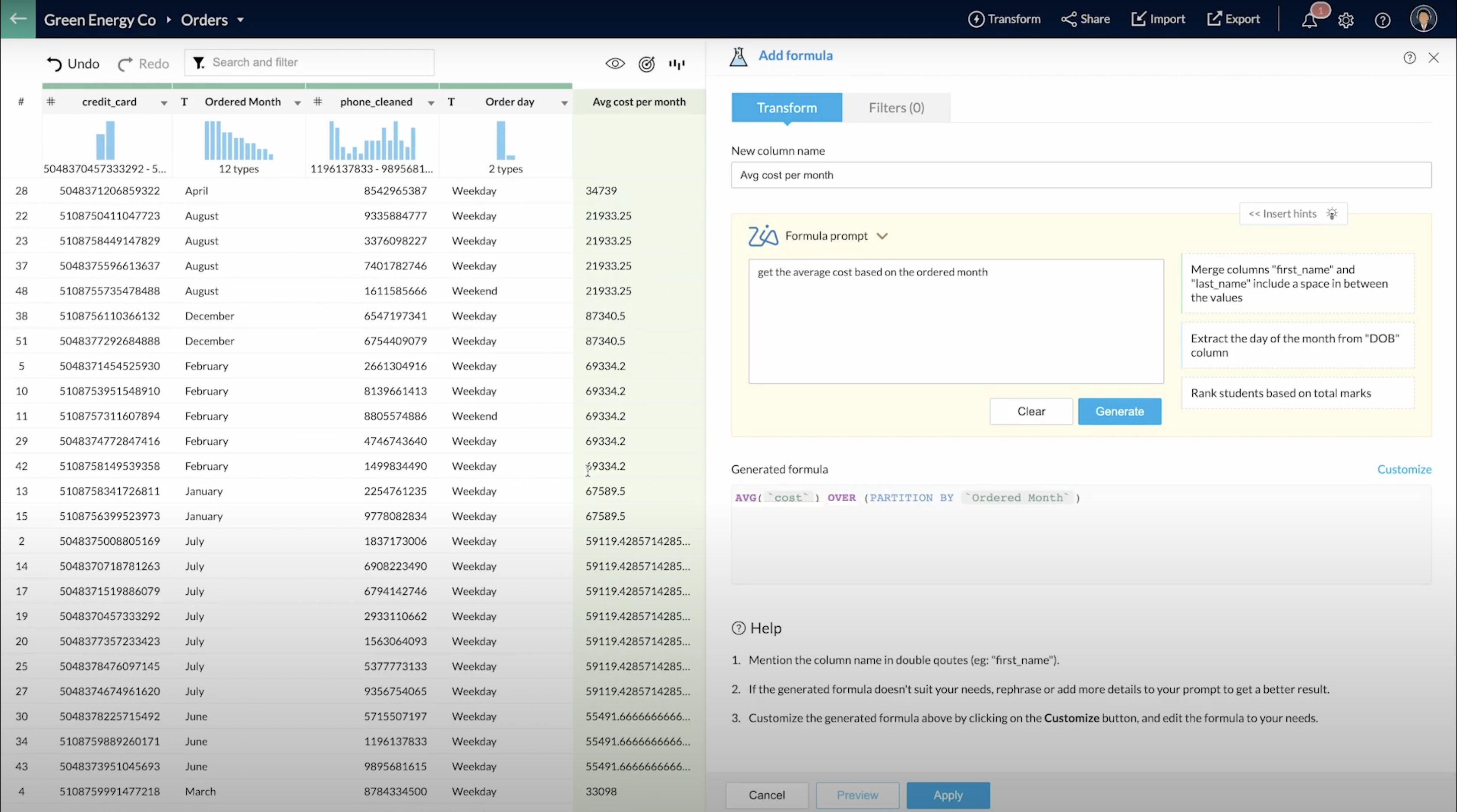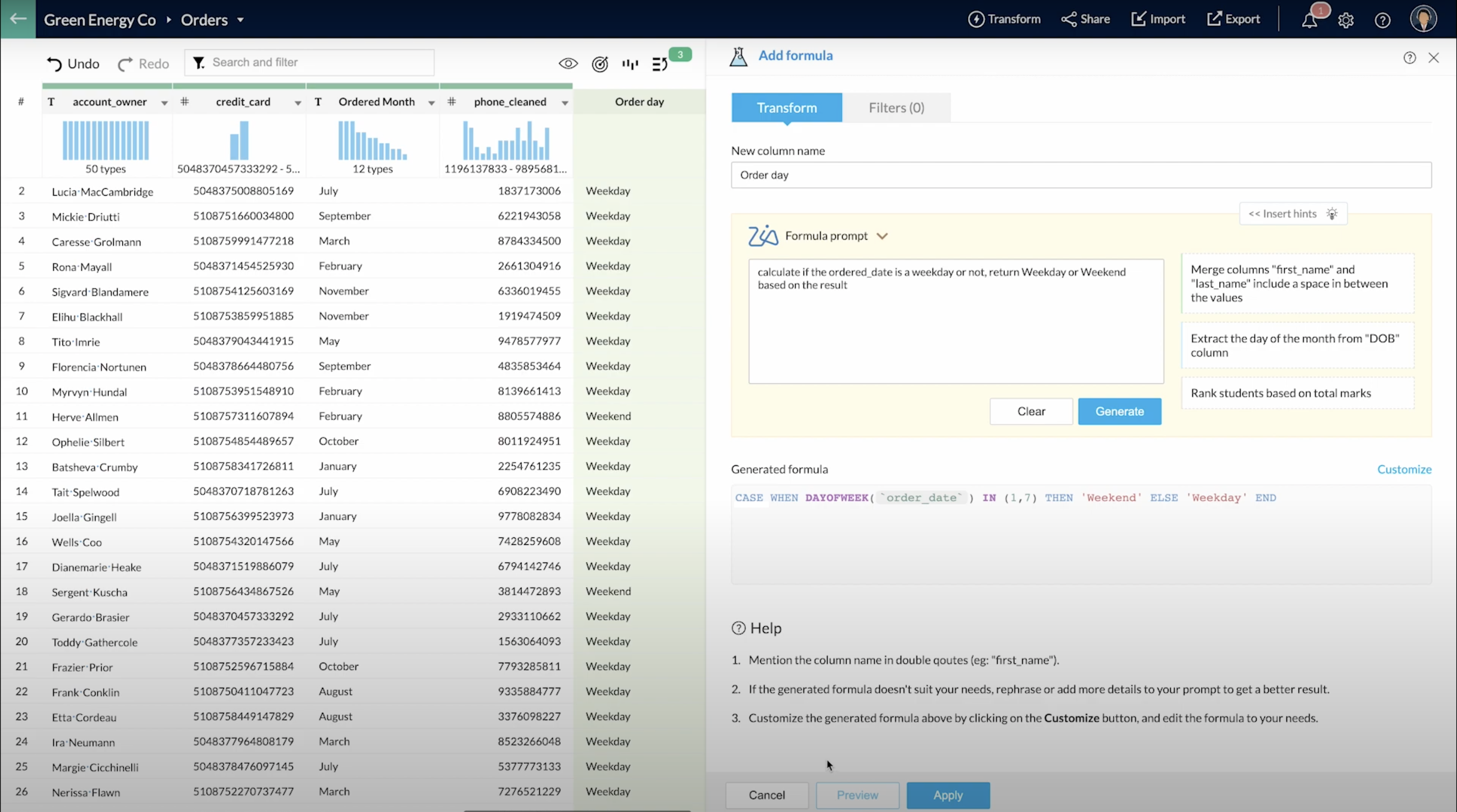 3. Describe the logic of your formula in natural language in the Formula prompt. As you enter the prompt, you can also mention the column names that you want the logic to apply to, and click Generate.