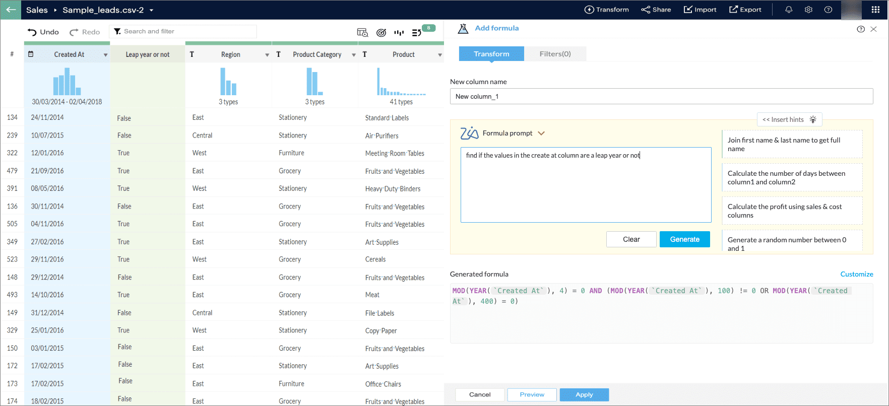 You can create new columns and customize them using the Formula column transform. Zoho DataPrep offers a variety of functions to suit your needs. Click