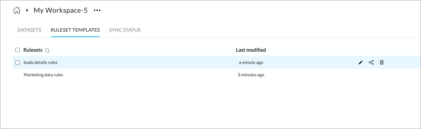 You can view all the Ruleset templates available in your workspace under the Ruleset Templates tab in the Workspace details page. The ruleset templates will be shown in the order of Last modified templates. You can view, share, rename and remove ruleset templates from here.