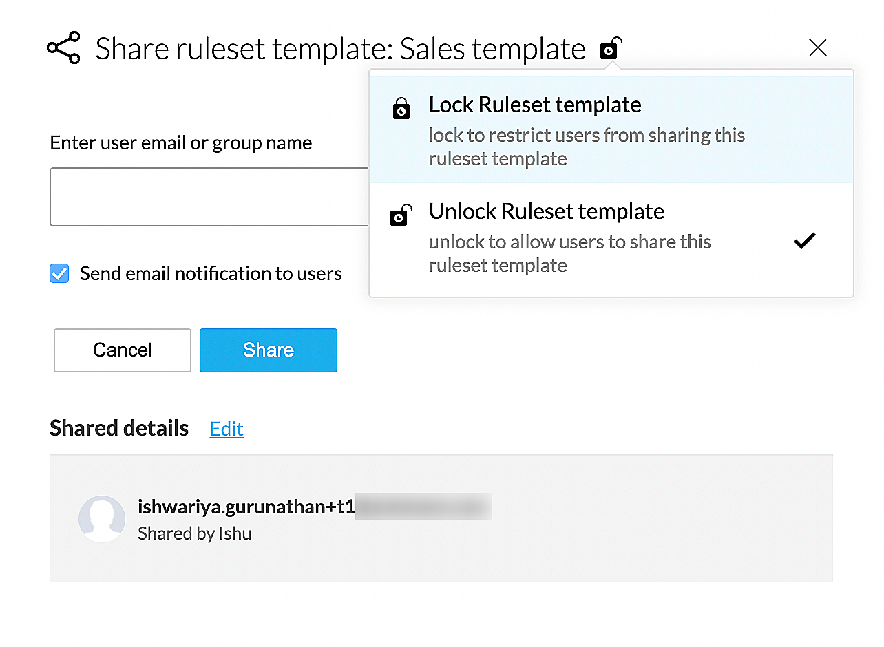 1. You can share the ruleset templates with individual users or with multiple users in groups along with an invitation mail.