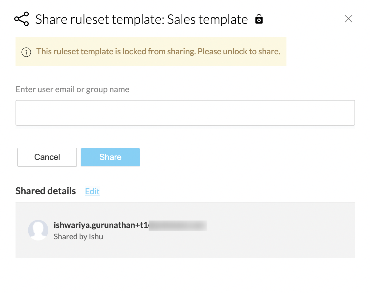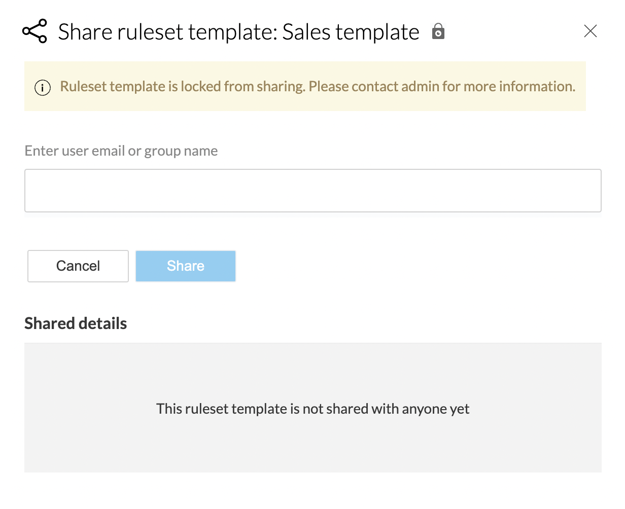 4. When locked, the other users with whom you have already shared the ruleset template can access it, but cannot share the ruleset template with anyone else.