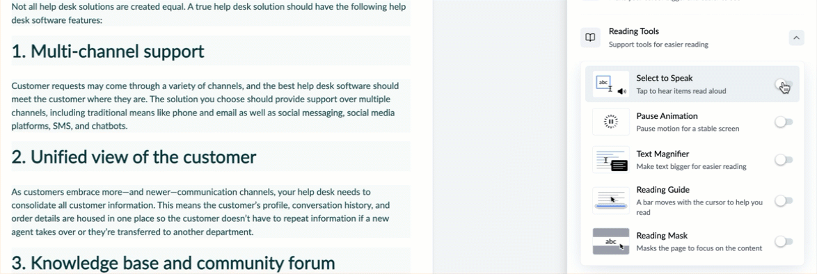 | Enables text-to-speech functionality as you scroll through the content. |