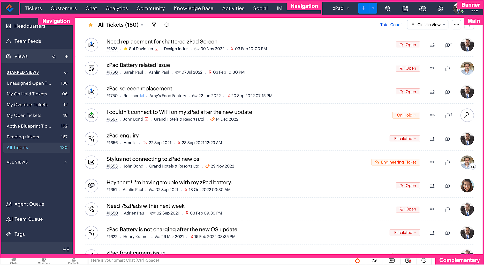 Ticket Detail View Left Panel, Ticket List Main: Displays a list of tickets based on your preference. You can switch between tickets from here.