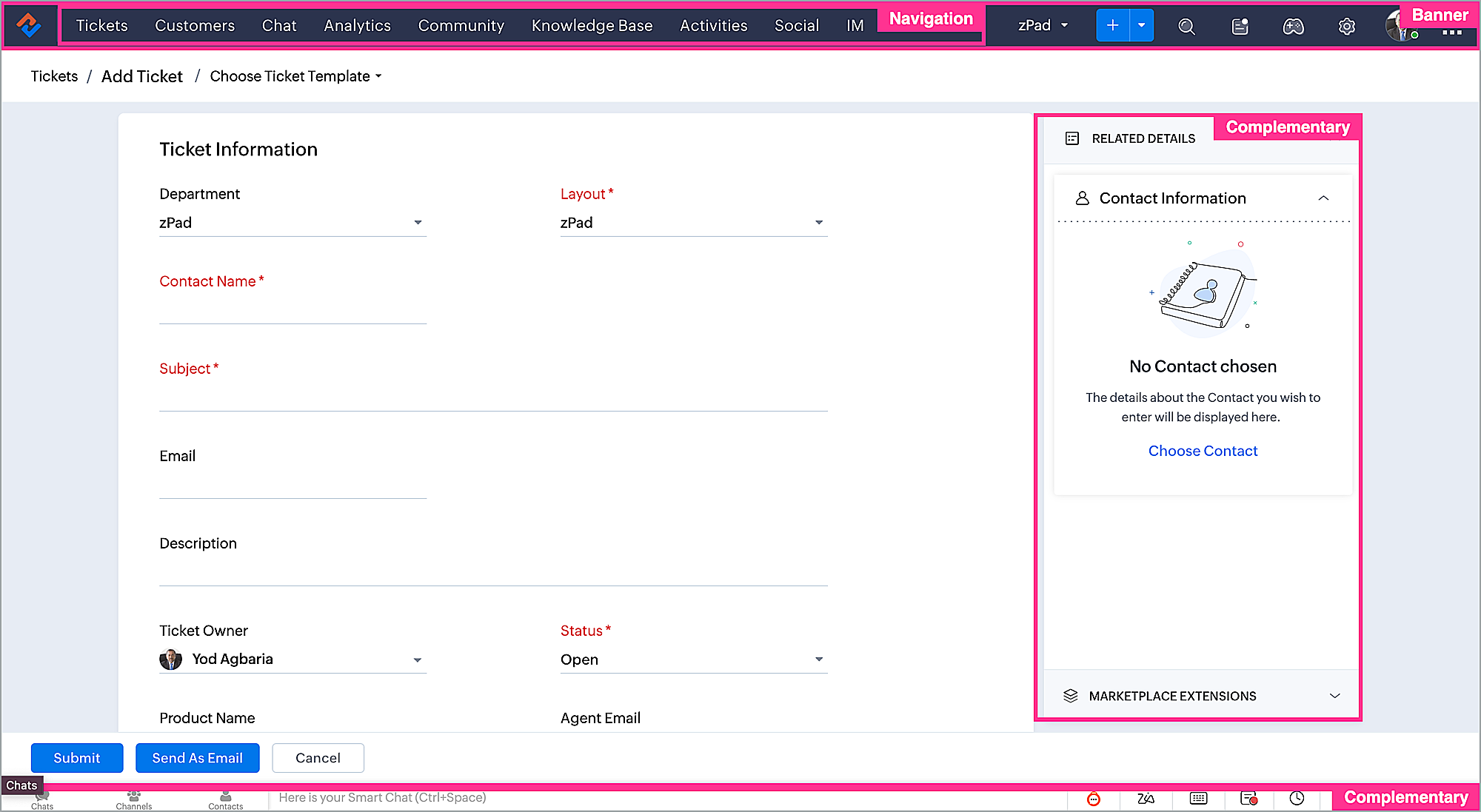 The following landmarks can be found on the Ticket List view, Detail view, and Create page: