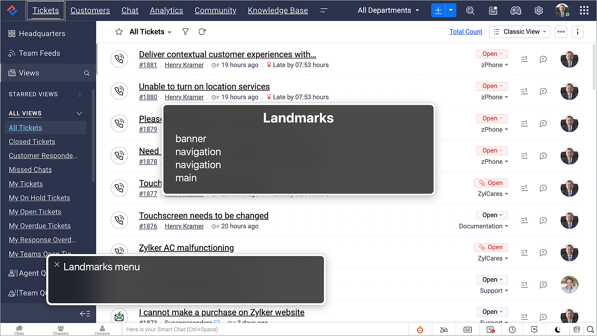 Landmarks are page regions in Zoho Desk. They are meant to simplify and speed up the navigation process for keyboard users. Essential pages, like the Ticket List View page, the Detail view, and the Ticket Add form are divided into distinct landmarks. Users can navigate to a landmark directly from the Landmark Navigation menu. This saves a lot of time and effort. Let’s examine the Ticket List View page, which has four landmarks. To read tickets in the main region, a user can either tab through all the modules and buttons on the top bar or open the Landmarks menu and choose the main region, which will take them directly to the ticket list.