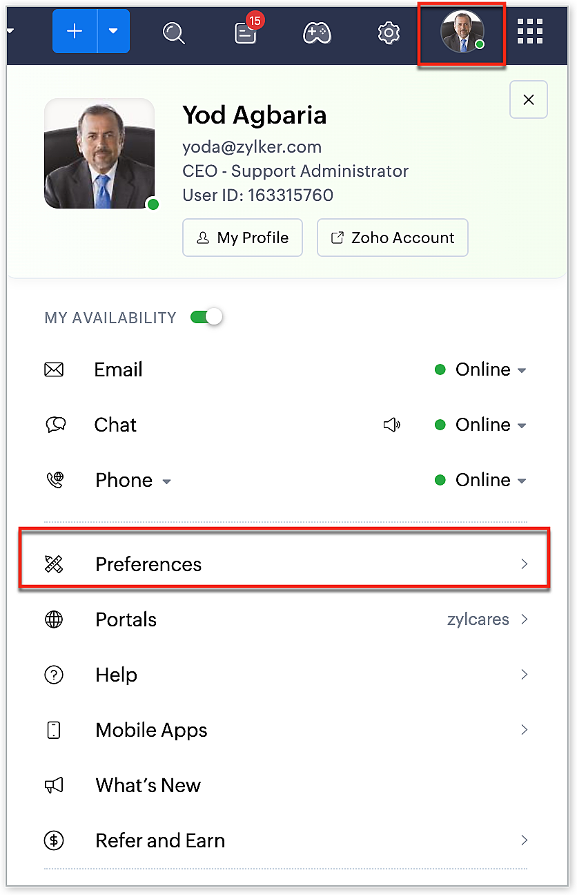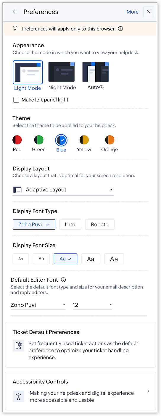 User preferences are reflected in your current browser. This means that if you access the Desk portal in different browsers, such as Chrome, Firefox, or Safari, you will need to set your preferences again for each browser. User preferences will only be applied to the following modules: Tickets, Contacts, Activities, Community, Instant Messaging, Social, and Analytics.