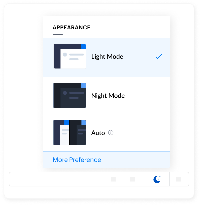 The Appearance Quick Switcher allows users to switch between different display modes using the button on the bottom bar. Its a convenient option that allows the users to change the modes quickly without navigating to the preferences settings.