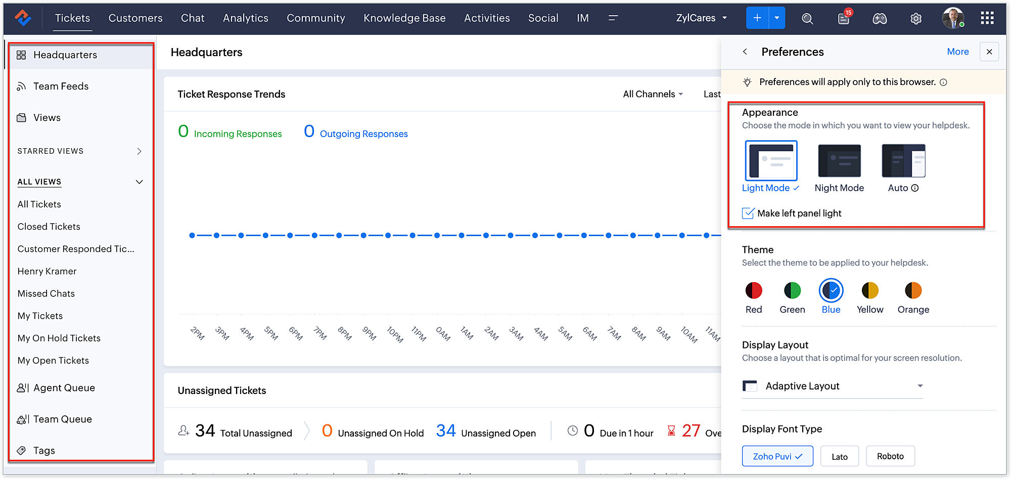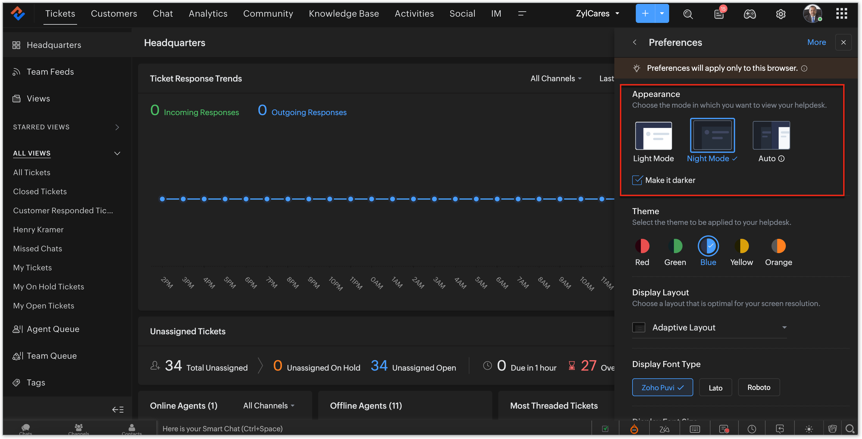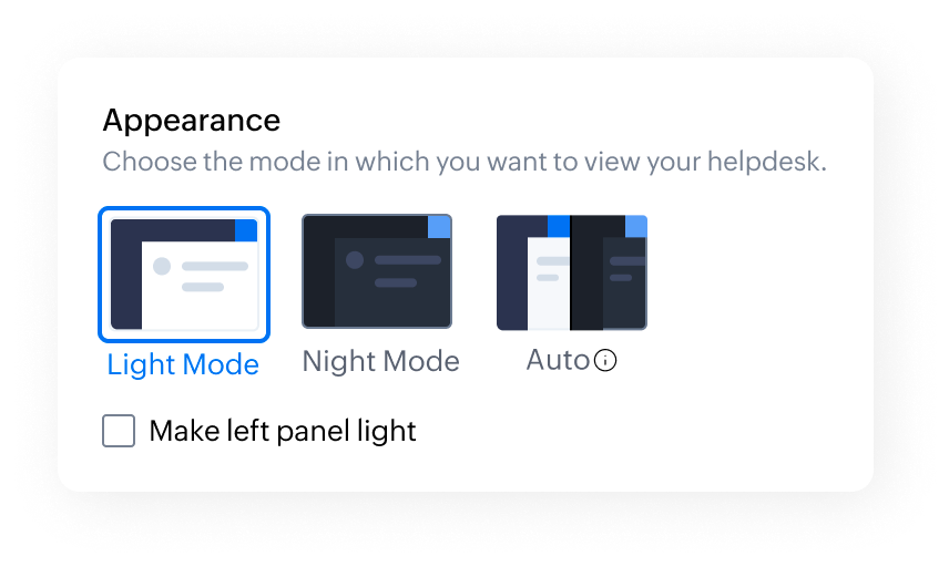 This section comprises the display modes, light, night, and auto, that ensures optimum screen brightness, which helps with the eye strain that can come with prolonged screen time. The option to choose between dark and light mode is a form of personalization that can have important implications for the overall usability and effectiveness of the Zoho Desk.
