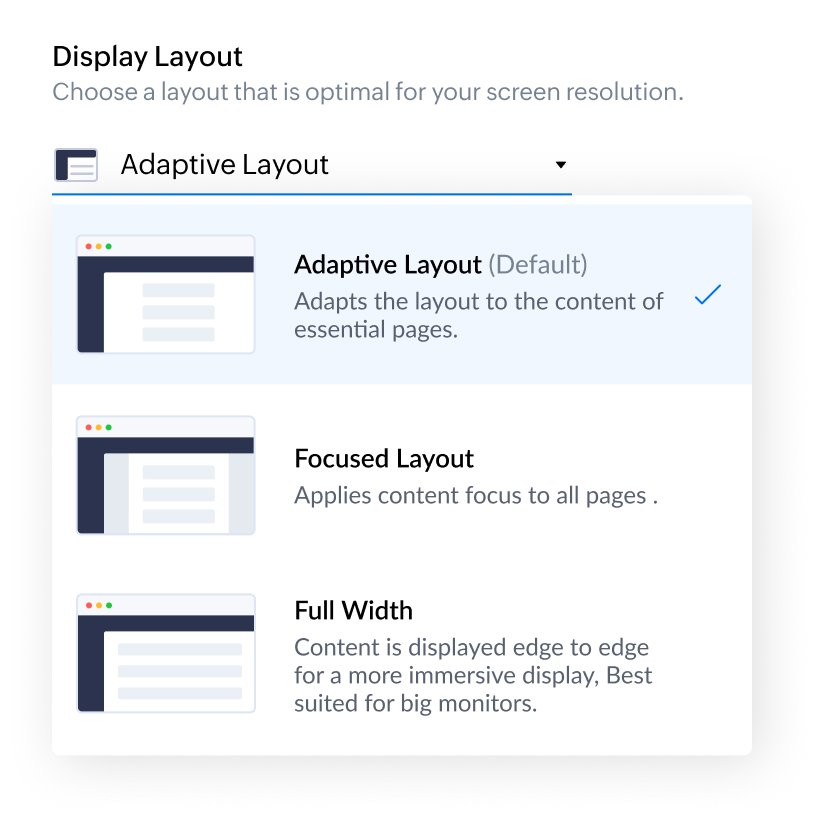 Display Layout allows users to choose the layout of the Zoho Desk interface that will be displayed to them. It defines how the information is presented on the page.