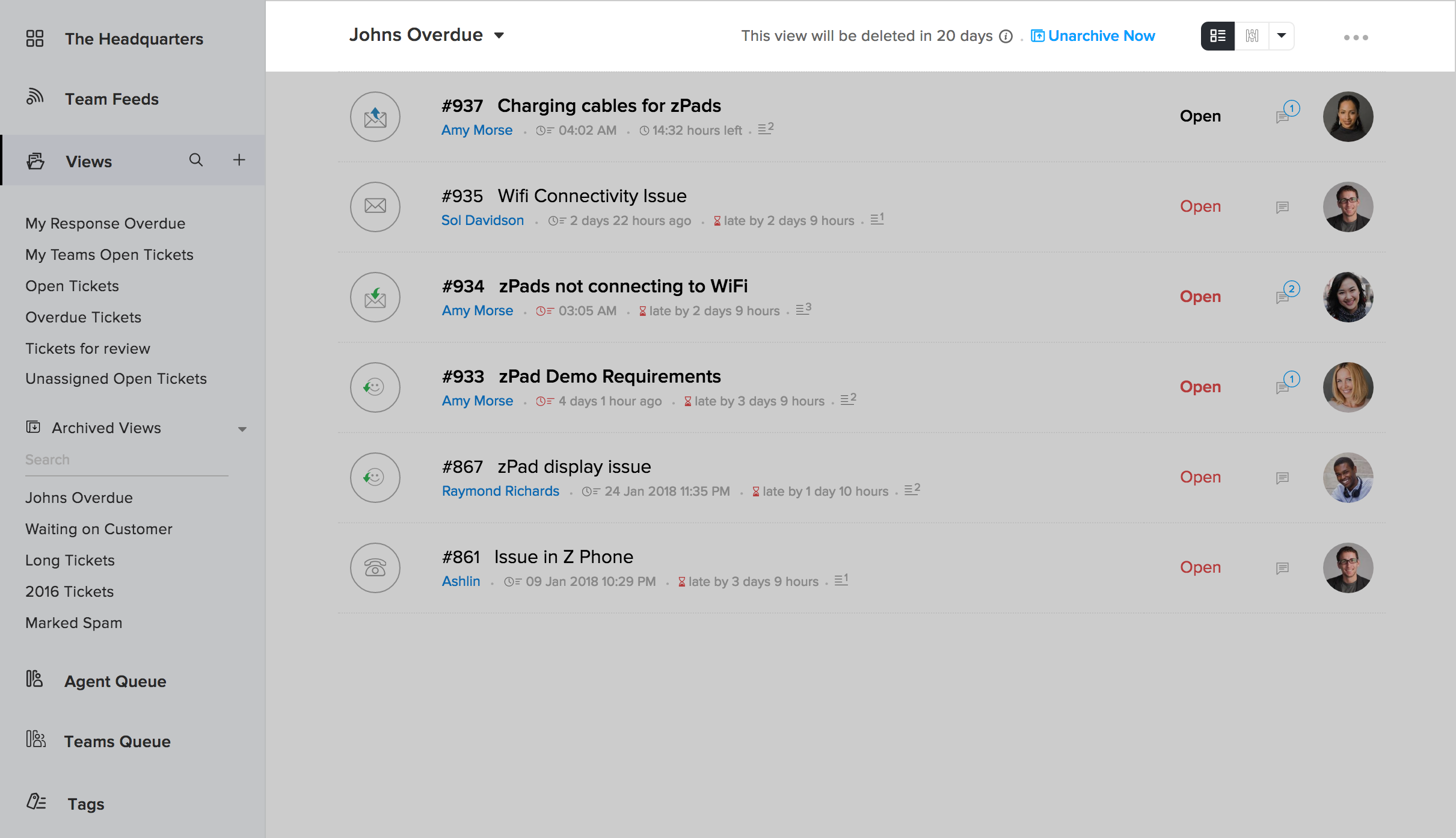 Zoho Desk auto-archives the different module-specific views you create in your help desk. To put it briefly, any view that remains unopened for 60 days will be archived and stored in a separate folder called Archived Views. If you wish to restore a view, you could do so within 30 days of archiving it. After 30 days, the view will be subsequently deleted.