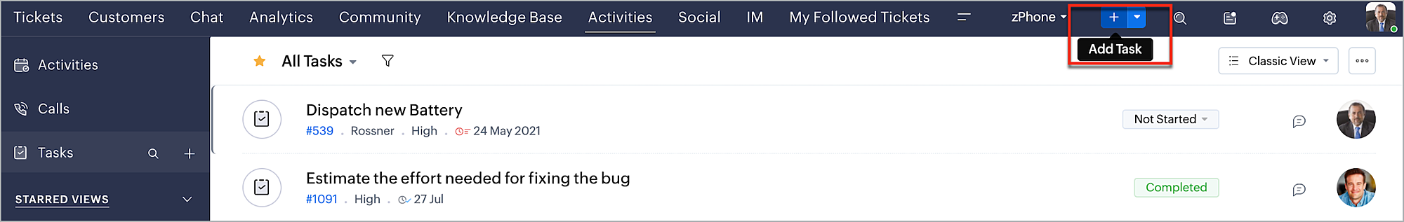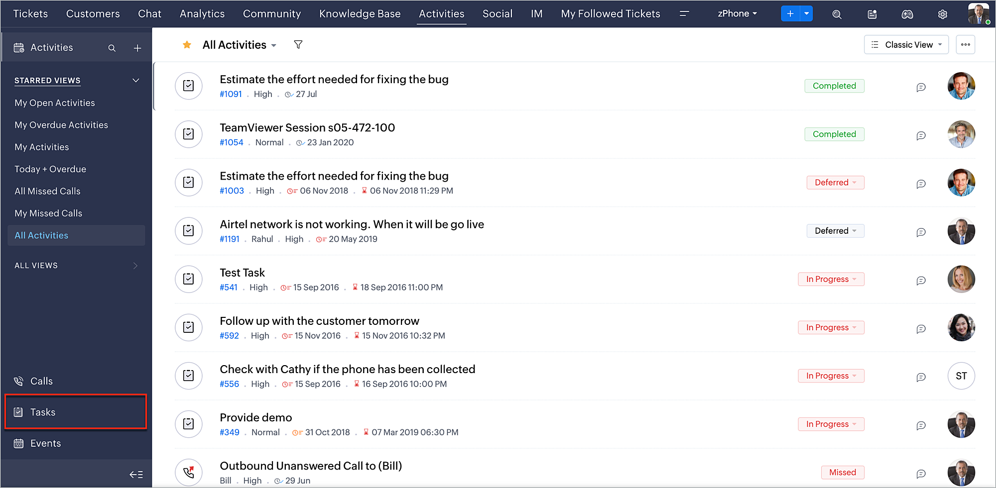 Once the tasks are created they can be viewed within the task list views. Zoho Desk provides a predefined list of views that cannot be edited.