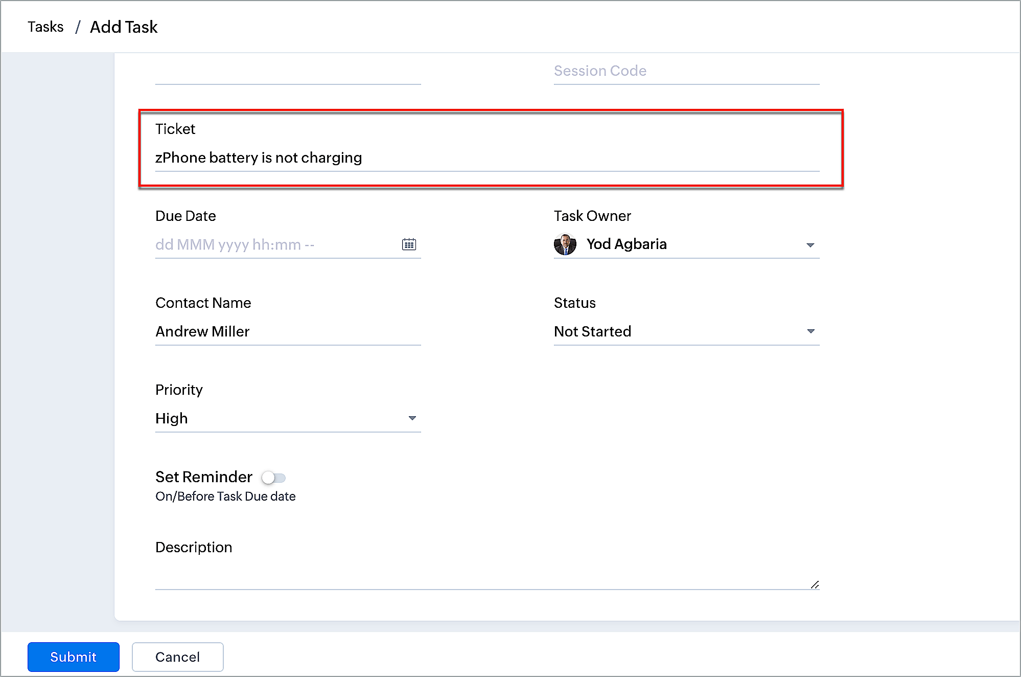 Agents can create tasks for themselves or support managers can create and assign them to the respective agents. While adding tasks the following details must be included: