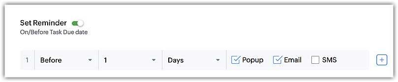 - Toggle Set Reminder, and specify on/before; number of days; minutes/hours/days; and the notification method email/popup/SMS.