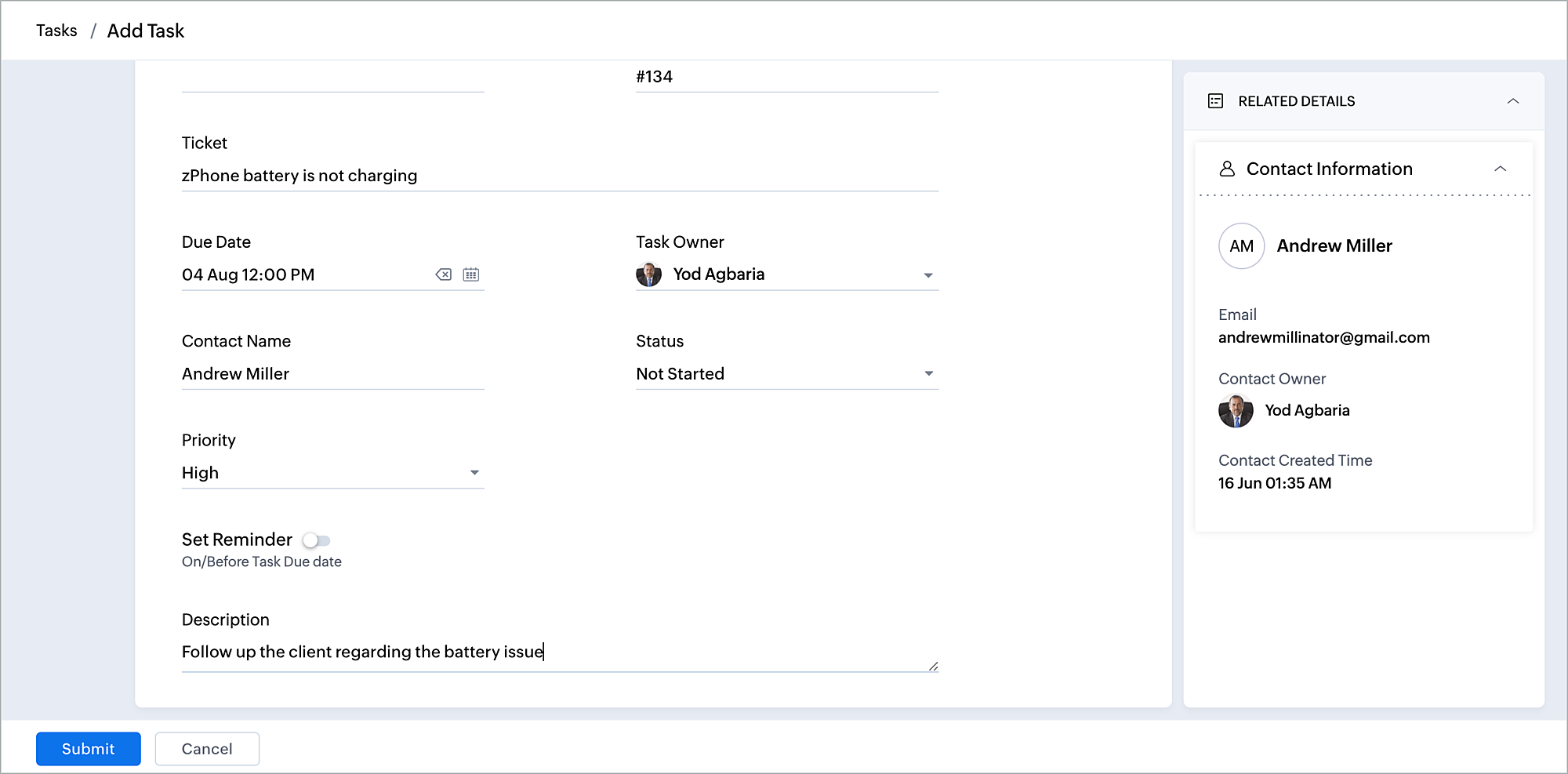For example, in the above scenario the agent can create a task for the refund issue and assign it to the payments team and also give the contact details so that the concerned person can look up other important details while working on the task.