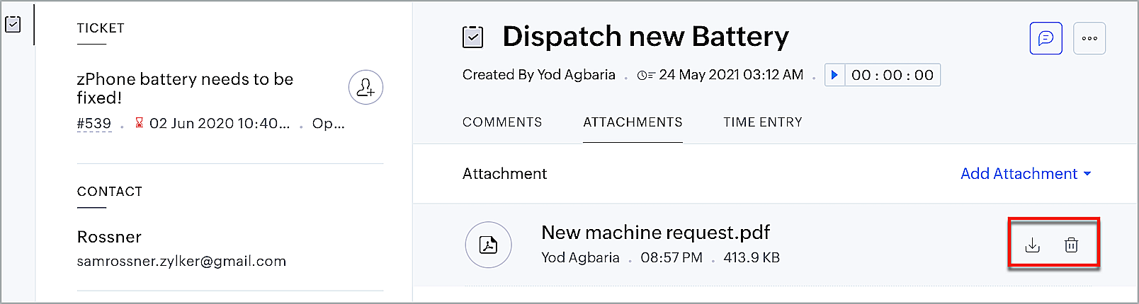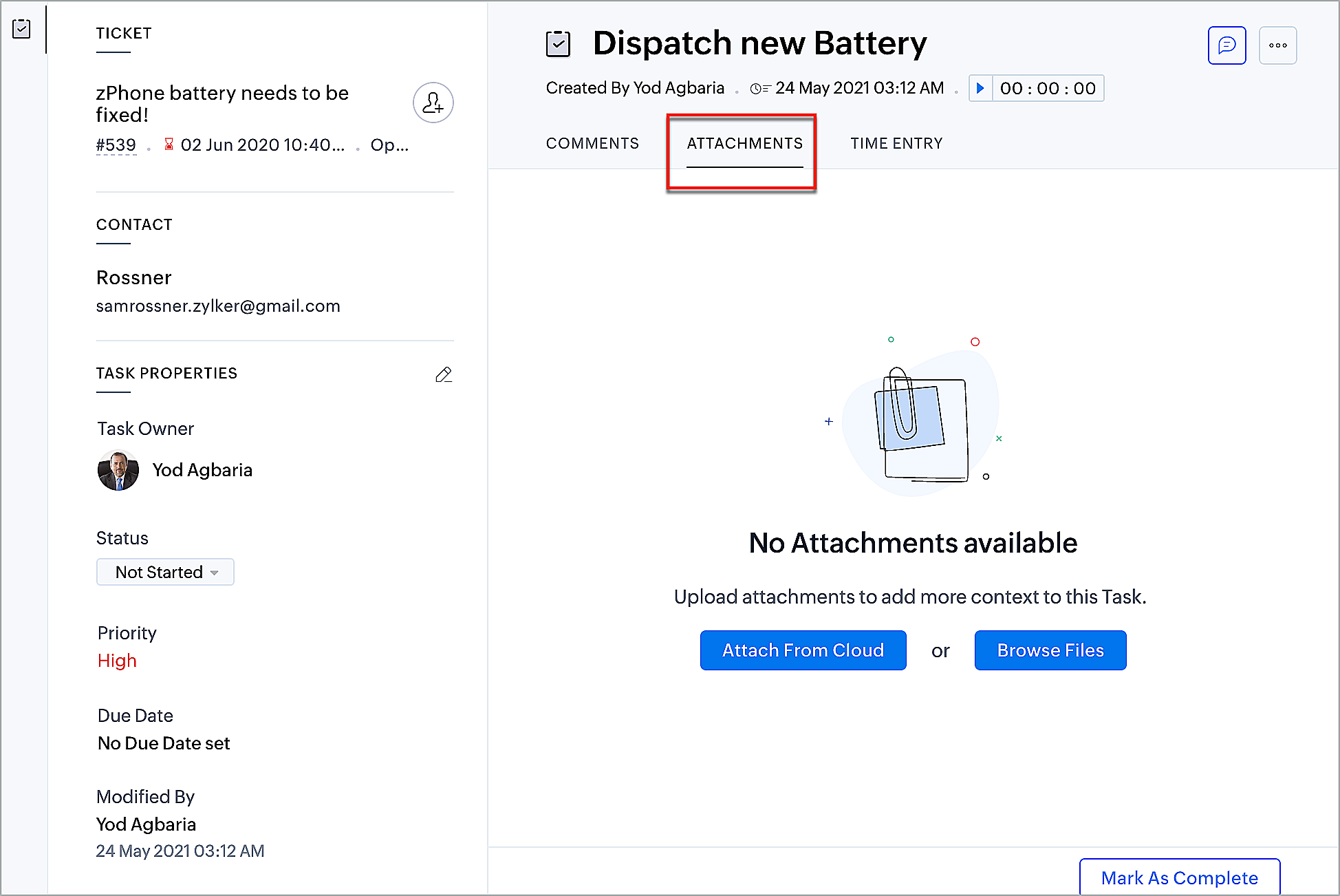 Once the task is created, you can add relevant information to it as an attachment. For example, you can attach user manuals, service documents, screen shots, or video of an issue that will help the support agent get better clarity and resolve issues faster.