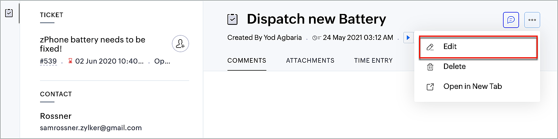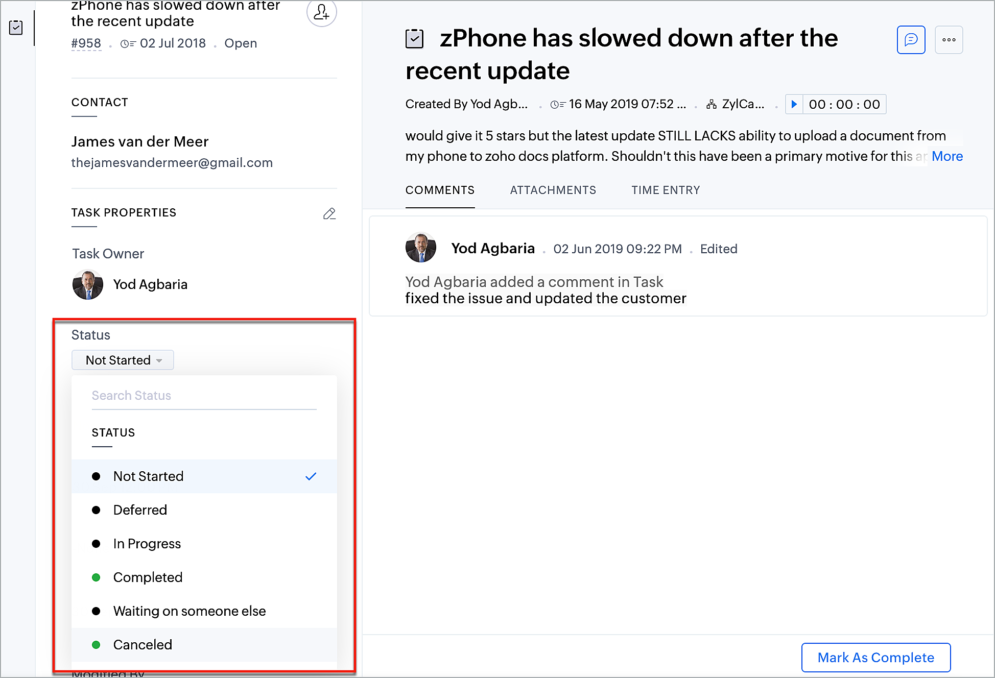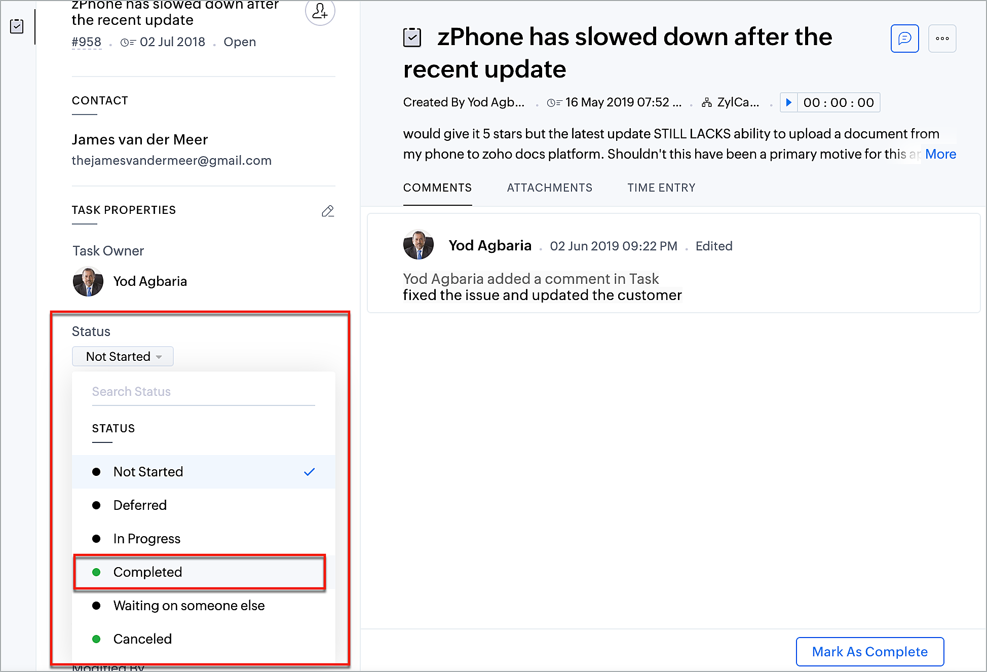 - You can also close or reopen a task using the Edit option from More (…) in the top-right corner of the task details page. In the Edit Task page, select the desired task status from the drop-down and click Save.