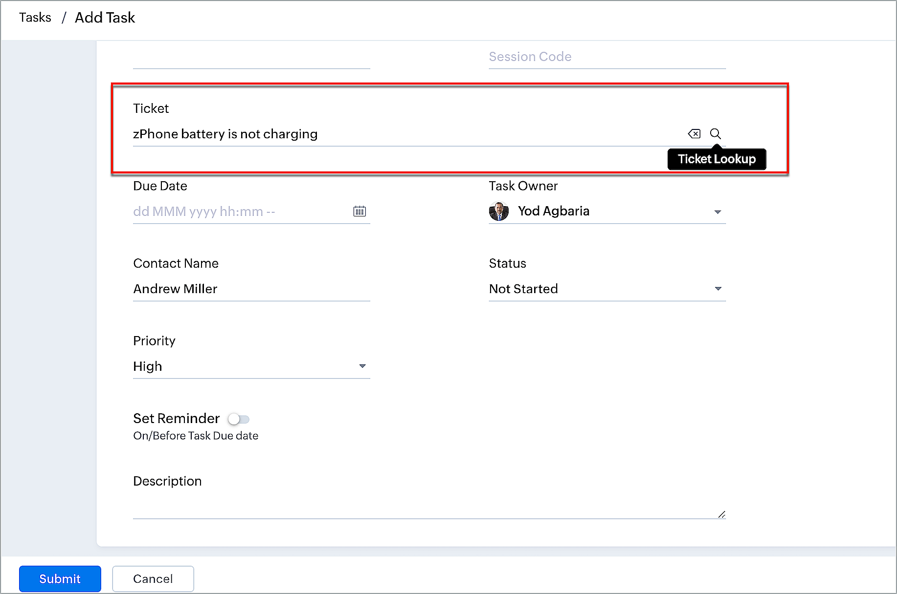 - In the Add Task page, search and map the desired ticket using the Ticket field.